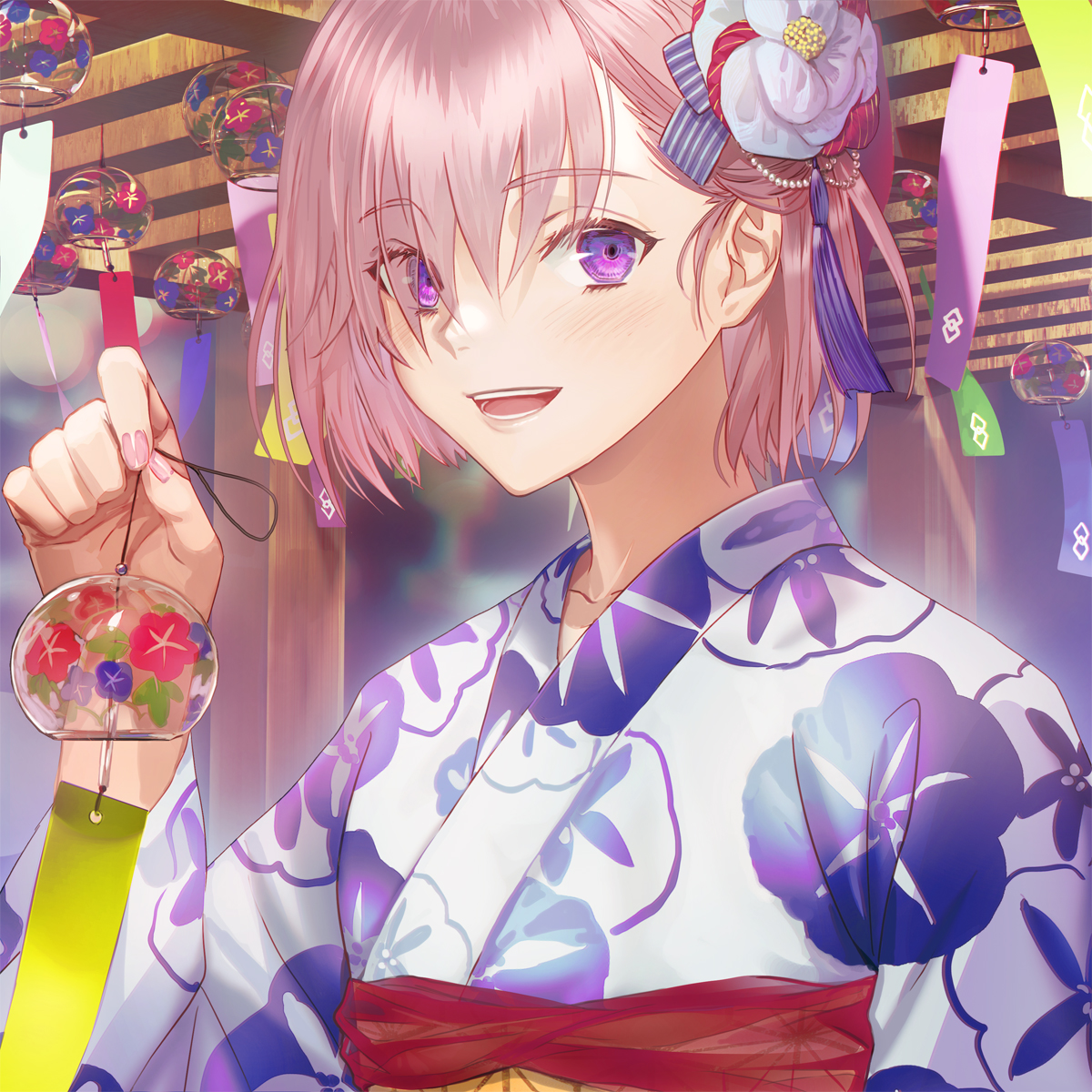 1girl blush commentary_request eyes_visible_through_hair fate/grand_order fate_(series) fingernails floral_print flower hair_flower hair_ornament hair_over_one_eye highres holding japanese_clothes kimono light_purple_hair lips looking_at_viewer mash_kyrielight nail_polish obi open_mouth panmijin99 pink_lips pink_nails purple_eyes sash short_hair smile solo teeth upper_body white_flower wind_chime yukata