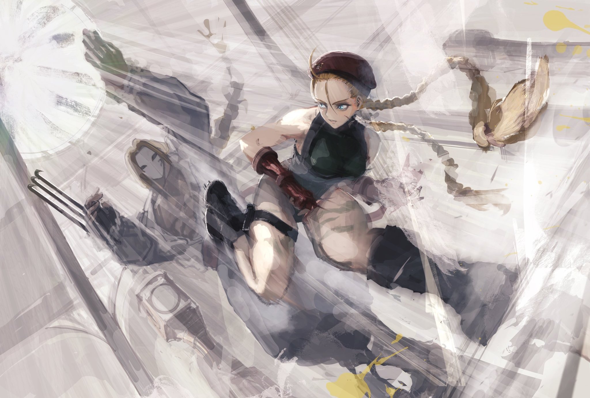 balrog_(street_fighter) braid cammy_white cap capcom gauntlets highres light_rays mask street_fighter