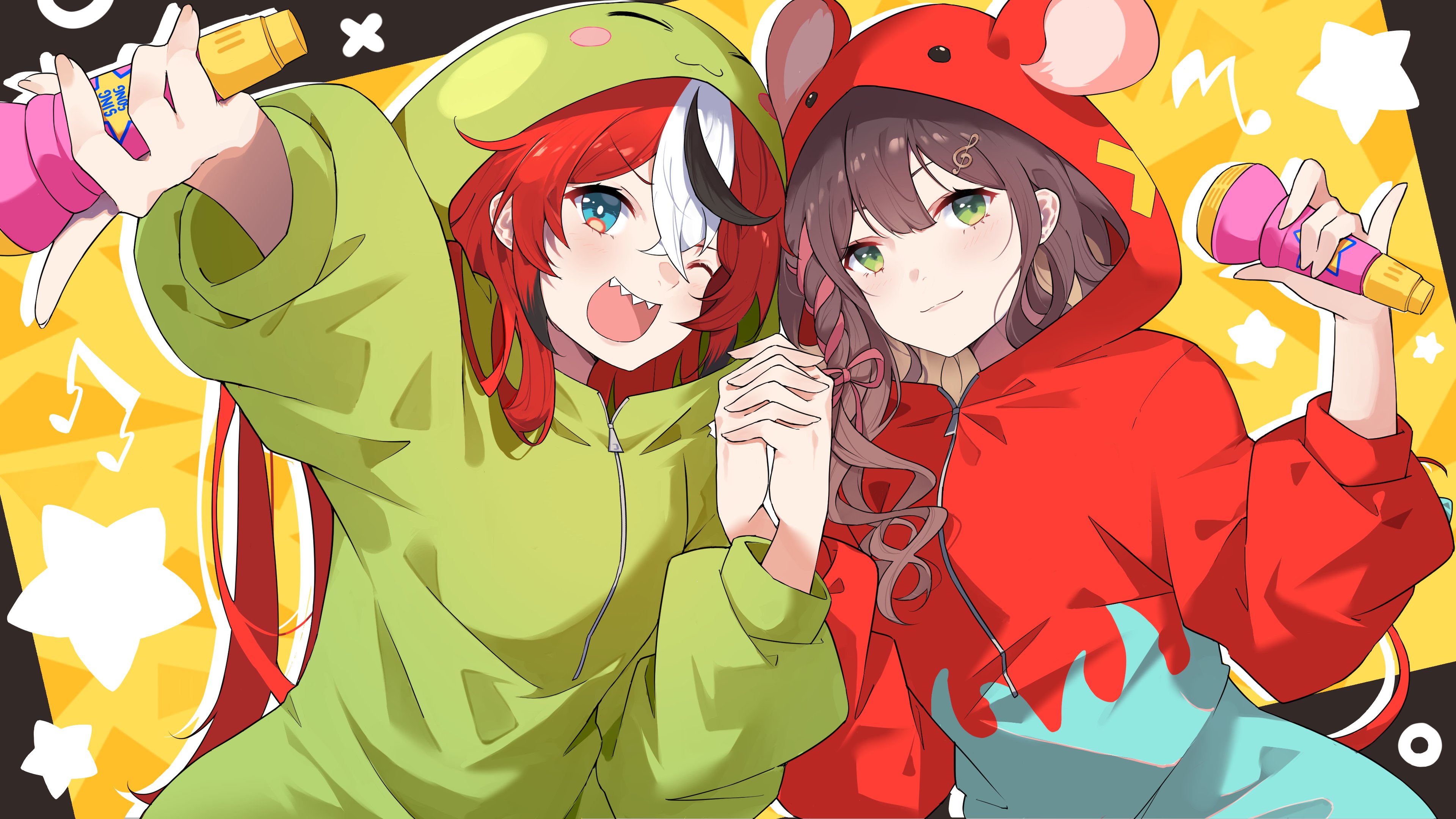 2girls absurdres alternate_costume animal_hood beamed_eighth_notes black_hair blonde_hair blue_eyes brown_hair closed_mouth commentary english_commentary green_eyes green_hoodie hakos_baelz highres holding holding_hands holding_microphone hololive hololive_english hood hoodie indie_virtual_youtuber interlocked_fingers long_sleeves looking_at_viewer microphone miori_celesta multicolored_hair multiple_girls mush_(mushlicious) musical_note open_mouth pinky_out red_hair red_hoodie sharp_teeth smile star_(symbol) streaked_hair teeth upper_body virtual_youtuber white_hair