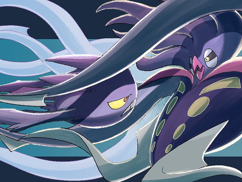 black_sclera colored_sclera commentary_request crobat eye_contact from_side frown gen_2_pokemon gen_6_pokemon half-closed_eyes looking_at_another malamar mukiguri nintendo no_humans open_mouth pokemon pokemon_(creature) teeth yellow_eyes