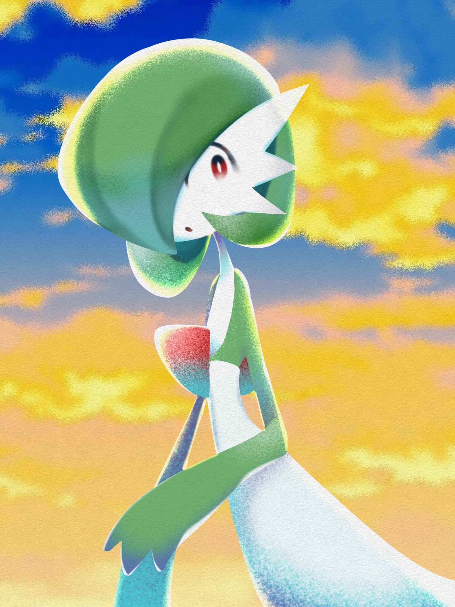 1girl 4shiki backlighting blue_sky bob_cut bright_pupils cloud colored_skin constricted_pupils day female_focus flat_chest gardevoir gen_3_pokemon green_hair green_skin hair_over_one_eye highres looking_back multicolored_skin nintendo one_eye_covered open_mouth orange_sky outdoors pokemon pokemon_(creature) red_eyes short_hair sky solo sunset two-tone_skin white_pupils white_skin