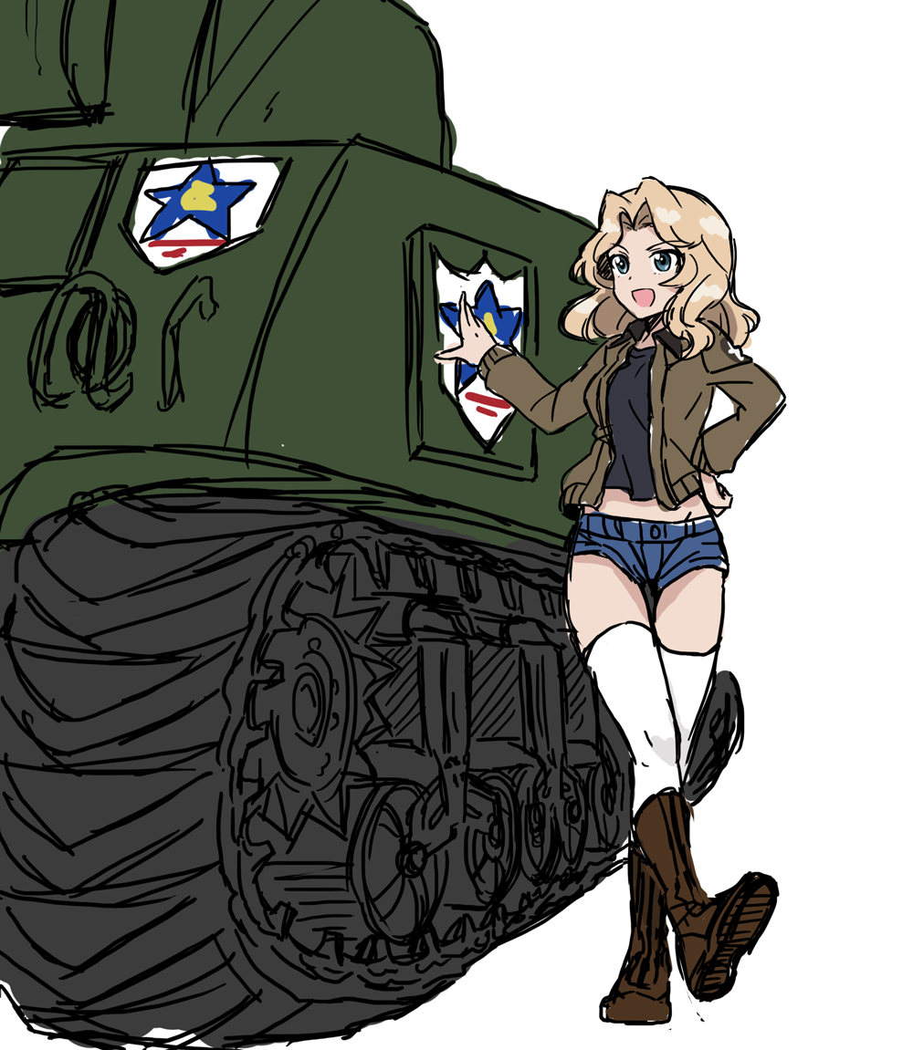 1girl blonde_hair cutoffs denim denim_shorts emblem girls_und_panzer inako_(pluto) kay_(girls_und_panzer) long_hair m4_sherman military military_vehicle motor_vehicle open_mouth saunders_(emblem) saunders_military_uniform shorts solo tank thighhighs white_background