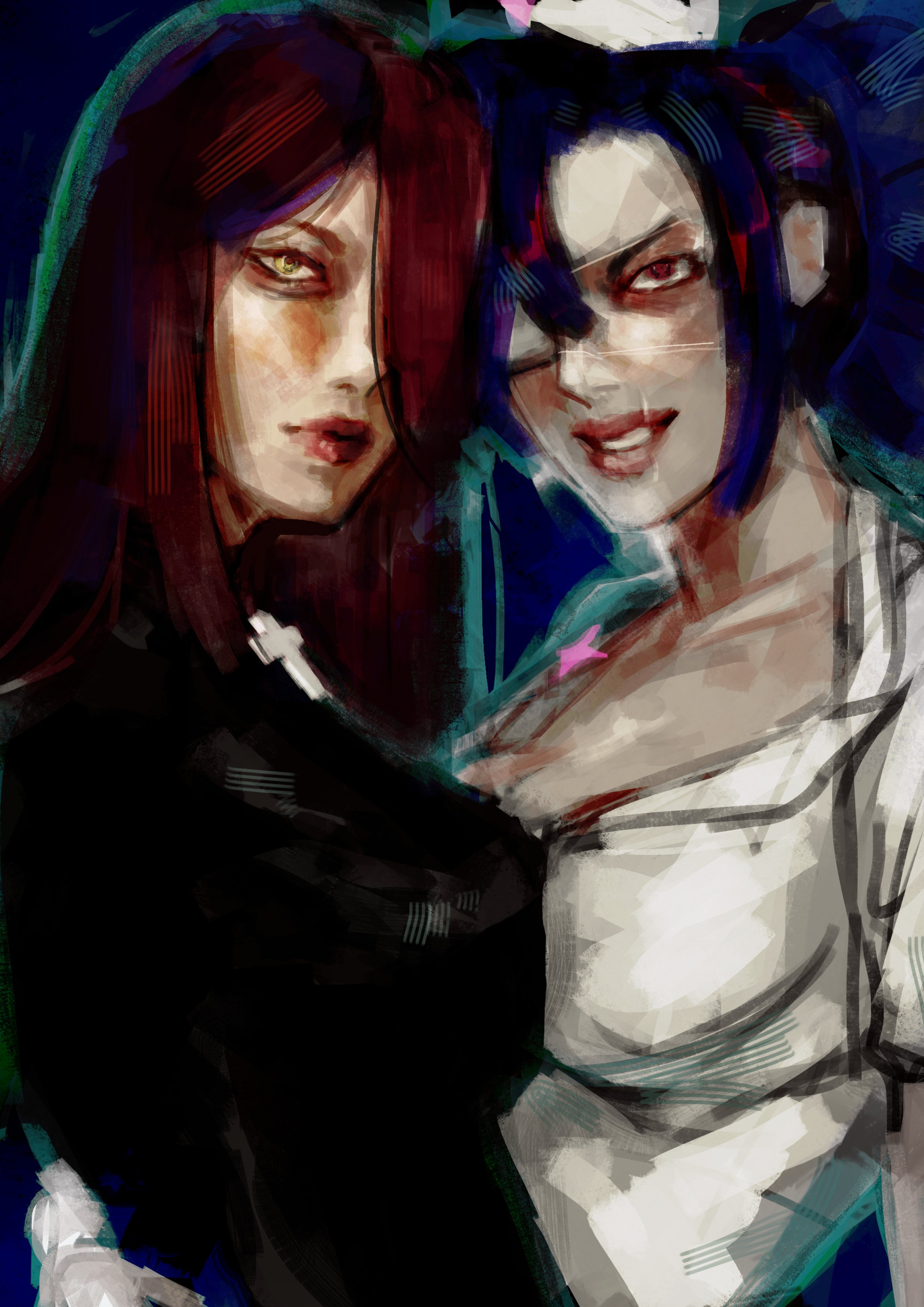 2girls absurdres blue_hair cross cross_necklace eyepatch hair_over_one_eye highres jewelry long_hair looking_at_viewer multiple_girls necklace parasoul_(skullgirls) red_eyes red_hair red_lips skullgirls squiiiiiiiigly upper_body valentine_(skullgirls) yellow_eyes