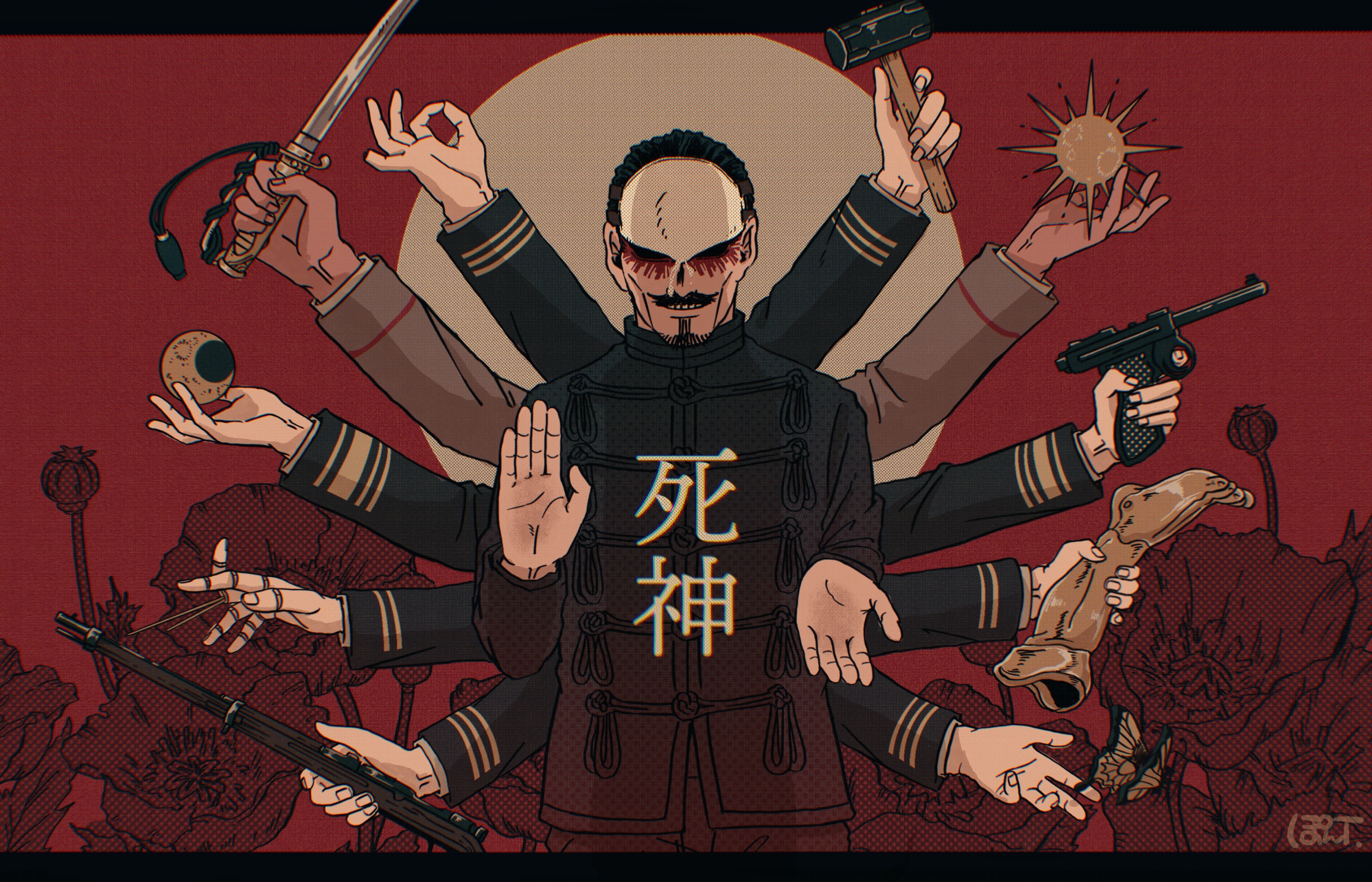 5boys bard black_hair bug butterfly character_request facial_hair flower forehead_protector golden_kamuy gun hammer highres holding holding_gun holding_hammer holding_sword holding_weapon insect koito_otonoshin long_sleeves military military_uniform multiple_boys mustache nikaidou_kouhei ok_sign pon_pan_82 prosthesis prosthetic_leg red_background scar sword tsurumi_tokushirou usami_tokishige weapon