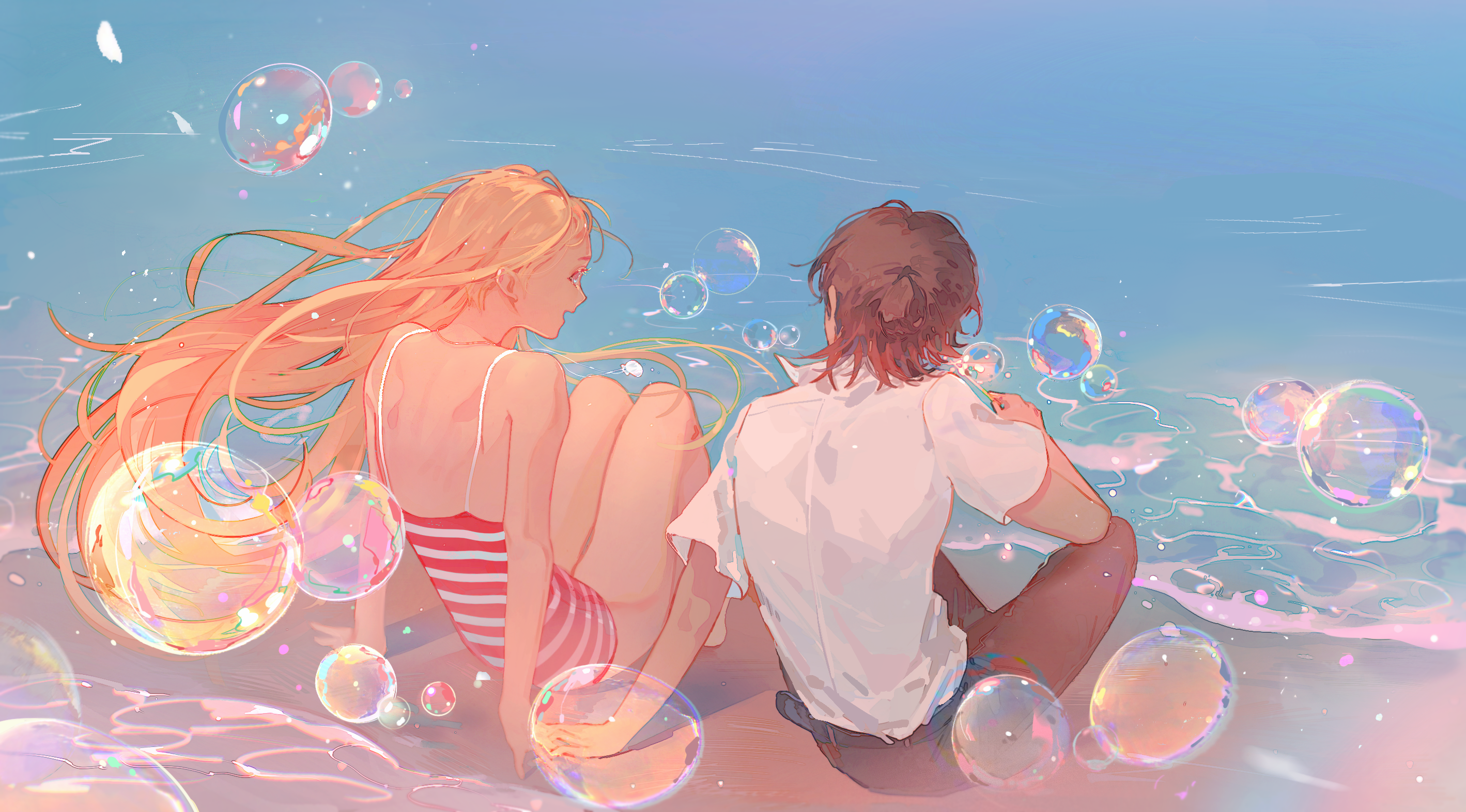 1boy 1girl ajiro_shinpei alternate_costume arm_support ayan477845 bare_arms bare_shoulders black_hair black_panties blonde_hair blue_eyes bubble_wand commentary floating_hair from_behind highres holding holding_hands kofune_ushio long_hair one-piece_swimsuit open_mouth panties red_one-piece_swimsuit shirt short_hair short_sleeves sitting smile soap_bubbles striped_clothes striped_one-piece_swimsuit summertime_render swimsuit underwear very_long_hair water white_shirt
