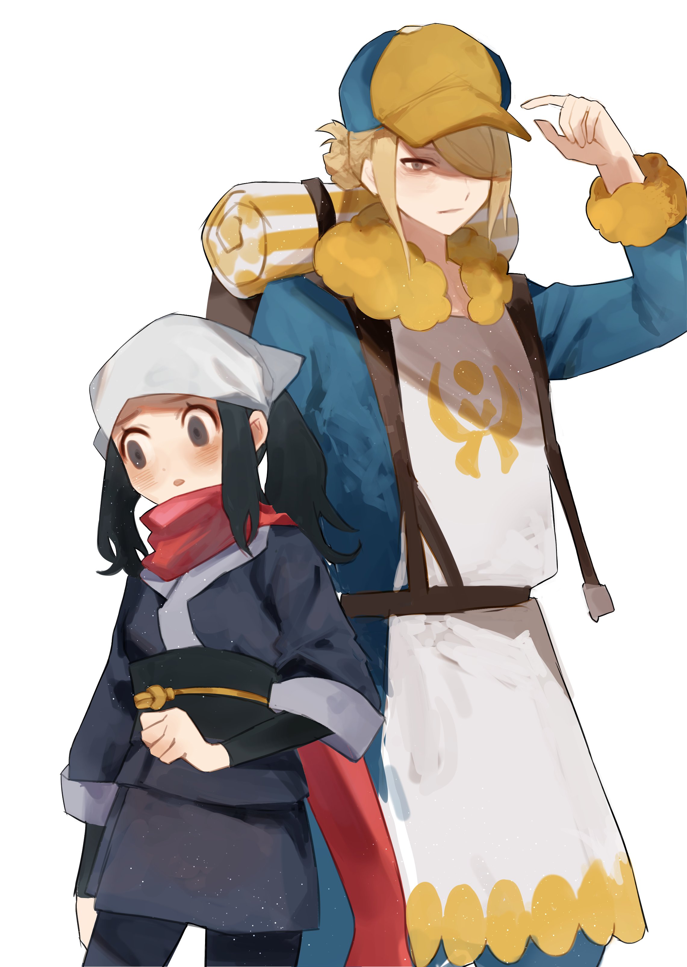 1boy 1girl absurdres akari_(pokemon) backpack bag black_eyes black_hair black_sash blonde_hair blush closed_mouth folded_ponytail fur_trim galaxy_expedition_team_survey_corps_uniform ginkgo_guild_uniform hair_over_one_eye haru_(ririne9999rine) hat headscarf highres long_hair long_sleeves nintendo parted_lips pokemon pokemon_legends:_arceus ponytail red_scarf sash scarf simple_background volo_(pokemon) white_background white_headscarf white_headwear