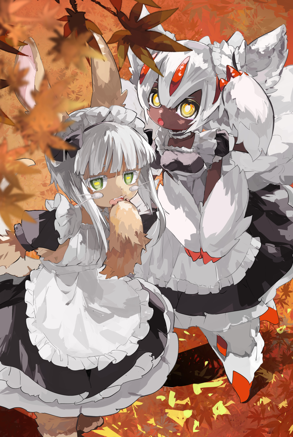 1girl 1other :o alternate_costume animal_ears apron arm_up autumn_leaves barefoot black_bow black_dress black_hair blunt_bangs bob_cut bow breasts bright_pupils brown_fur choker claws commentary_request dark-skinned_female dark_skin detached_collar dress enmaided extra_arms fangs faputa fewer_digits frilled_apron frilled_choker frilled_dress frills furry green_eyes grey_hair hair_between_eyes hand_to_own_mouth highres horizontal_pupils ichi_(two_too_22) inverted_bob leaf leaning_forward legs_apart looking_at_viewer made_in_abyss maid medium_hair multiple_tails nanachi_(made_in_abyss) neck_ribbon open_mouth orange_background puffy_short_sleeves puffy_sleeves ribbon short_sleeves small_breasts standing tail teeth upper_teeth_only v_arms very_dark_skin whiskers white_apron white_fur white_hair white_pupils white_ribbon yellow_eyes yellow_pupils