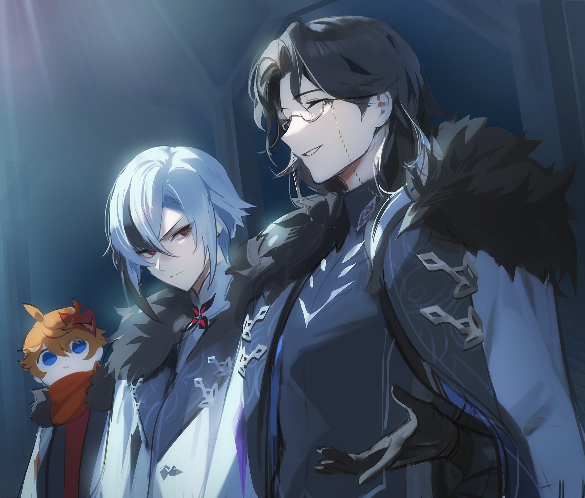 0jae 1girl 2boys arlecchino_(genshin_impact) black_eyes black_gloves black_hair closed_eyes coat earrings eyewear_strap fatui_coat fur-trimmed_coat fur_trim genshin_impact glasses gloves highres jewelry korean_commentary mask mask_on_head multicolored_hair multiple_boys open_clothes open_coat orange_hair pantalone_(genshin_impact) parted_lips red_mask red_pupils red_scarf scarf single_earring streaked_hair symbol-shaped_pupils tartaglia_(genshin_impact) upper_body x-shaped_pupils