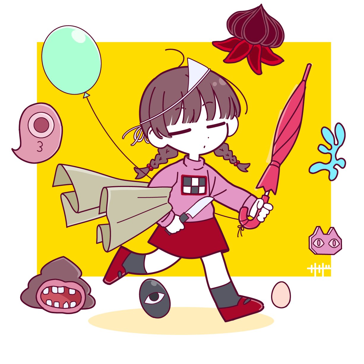 1girl balloon black_socks braid brown_hair chibi closed_eyes closed_mouth closed_umbrella commentary egg full_body highres holding holding_knife holding_umbrella knife long_sleeves madotsuki mary_janes pink_sweater pink_umbrella red_shoes red_skirt safe3133 shoes skirt socks sweater untranslatable_commentary triangular_headpiece turtleneck turtleneck_sweater twin_braids umbrella walking yume_nikki