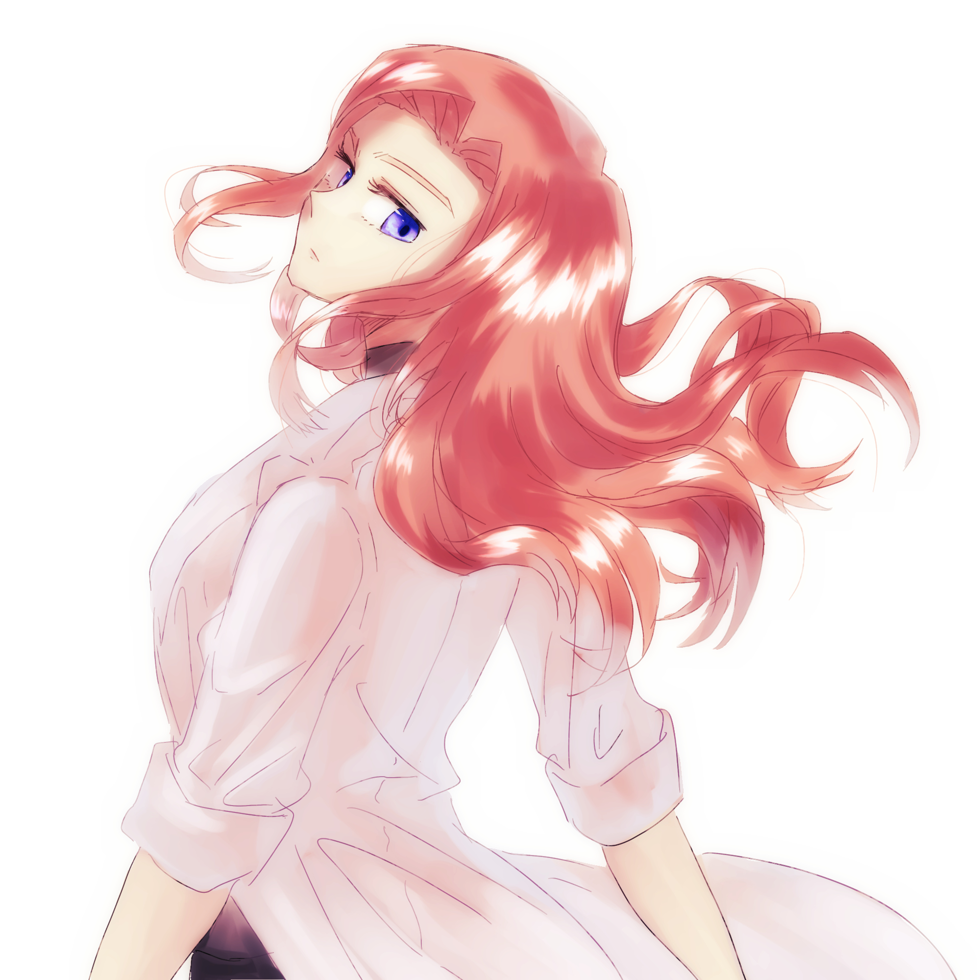 1girl animification apex_legends ashleigh_reid blue_eyes expressionless floating_hair from_behind head_tilt highres lab_coat long_hair looking_back looking_down orange_hair sacchan_(sacchan_18) solo white_background