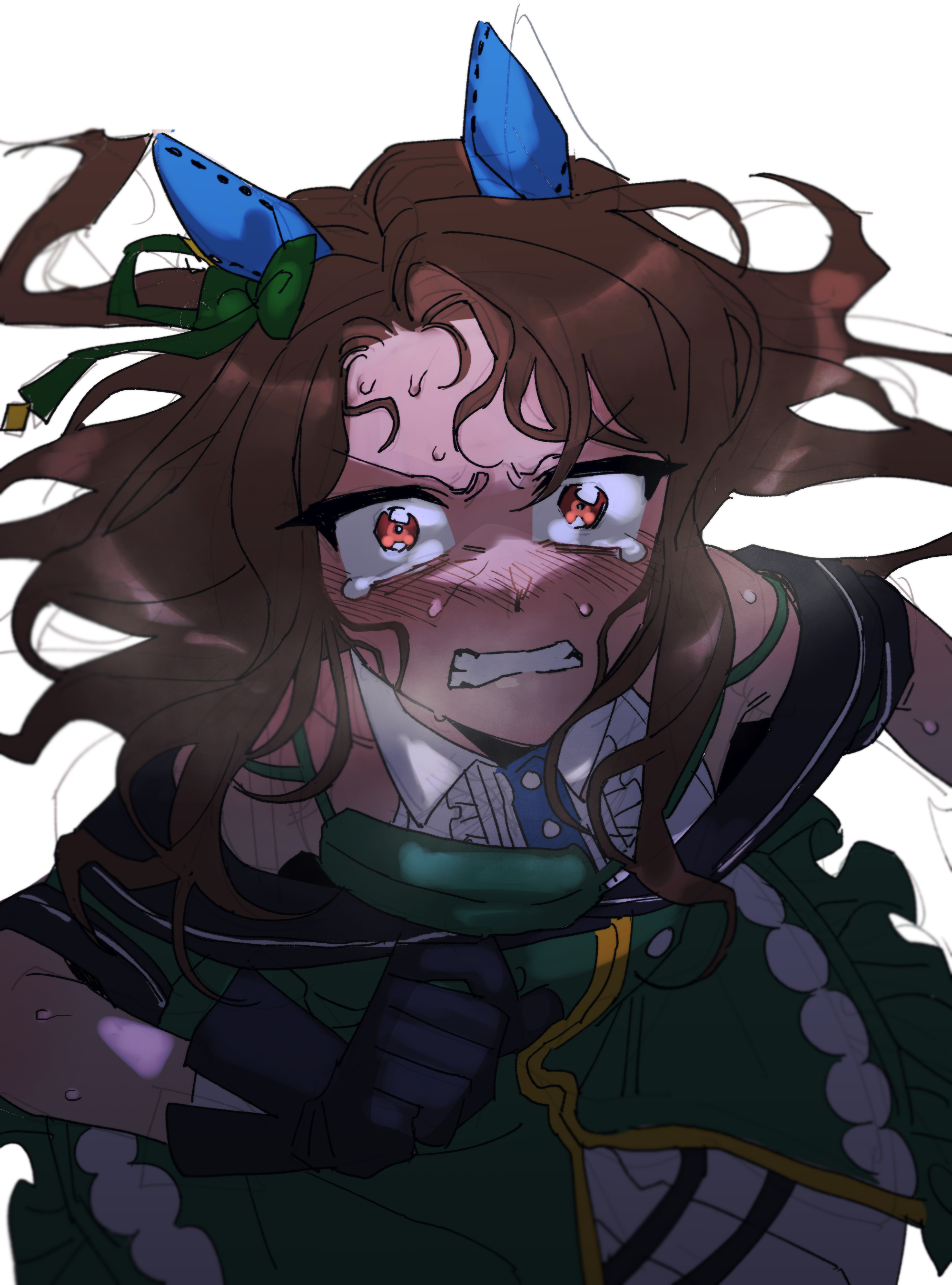 1girl absurdres animal_ears black_gloves blush bow brown_hair crying crying_with_eyes_open dress ear_covers gloves green_dress hair_bow highres horse_ears horse_girl king_halo_(umamusume) long_hair ratsays_squeak red_eyes simple_background solo sweat tears teeth umamusume white_background