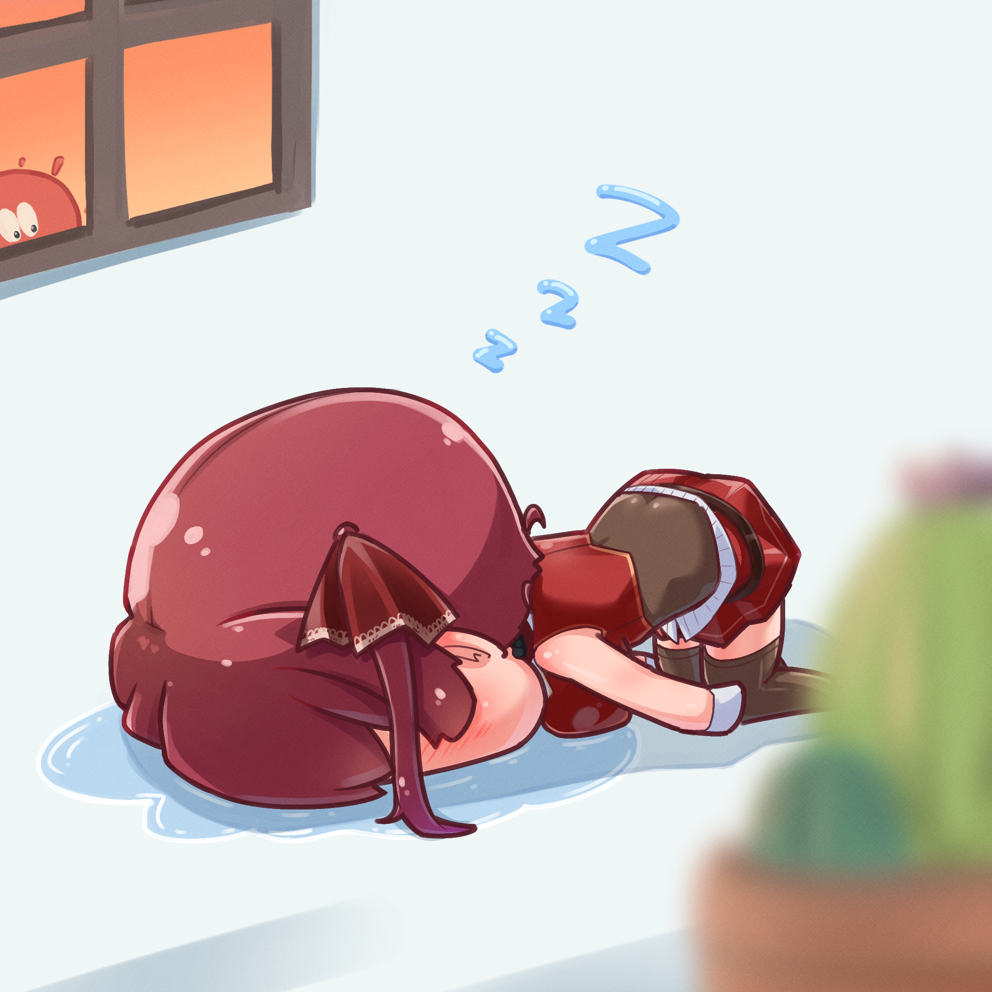 berotore blurry breast_rest breasts butt_crack cactus day depth_of_field gloves highres hololive houshou_marine large_breasts mini_person minigirl miniskirt orange_sky plant pleated_skirt potted_plant red_hair red_skirt skirt sky sleeping sun sunset tears thighhighs top-down_bottom-up twintails virtual_youtuber white_gloves window zettai_ryouiki zzz