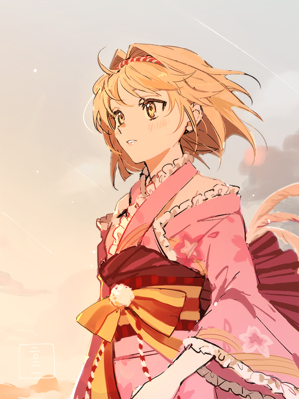 1girl ahoge blonde_hair cunonn djeeta_(granblue_fantasy) frilled_kimono frilled_sleeves frills from_side granblue_fantasy hair_intakes japanese_clothes kimono light_blush medium_hair obi parted_lips pink_kimono sash solo wide_sleeves yellow_eyes yukata