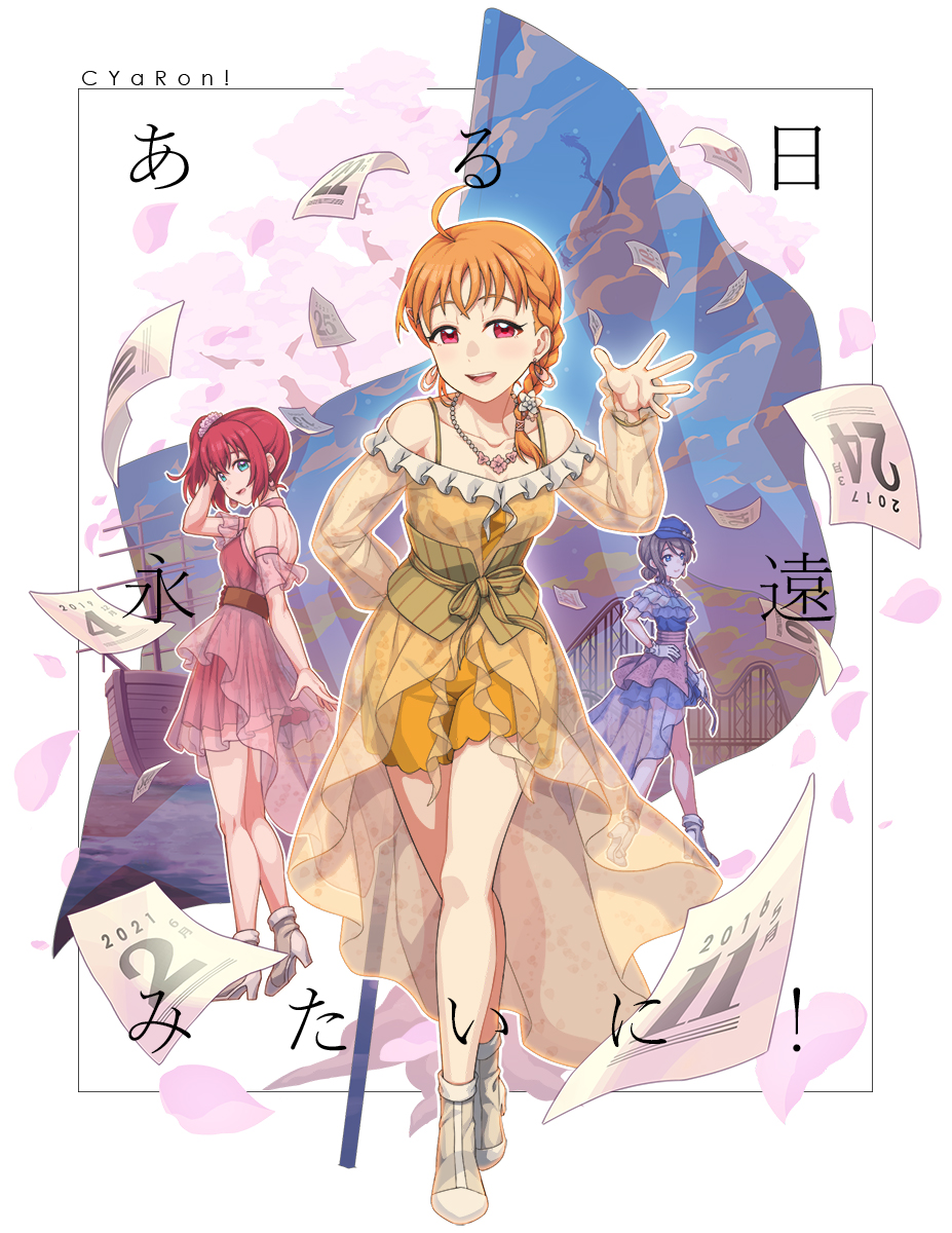 3girls ahoge bare_legs blue_dress blue_eyes braid calendar cyaron!_(love_live!) dress green_eyes grey_hair highres kurosawa_ruby looking_at_viewer love_live! love_live!_sunshine!! multiple_girls orange_dress orange_hair pink_dress ponytail red_eyes red_hair takami_chika waste-man watanabe_you