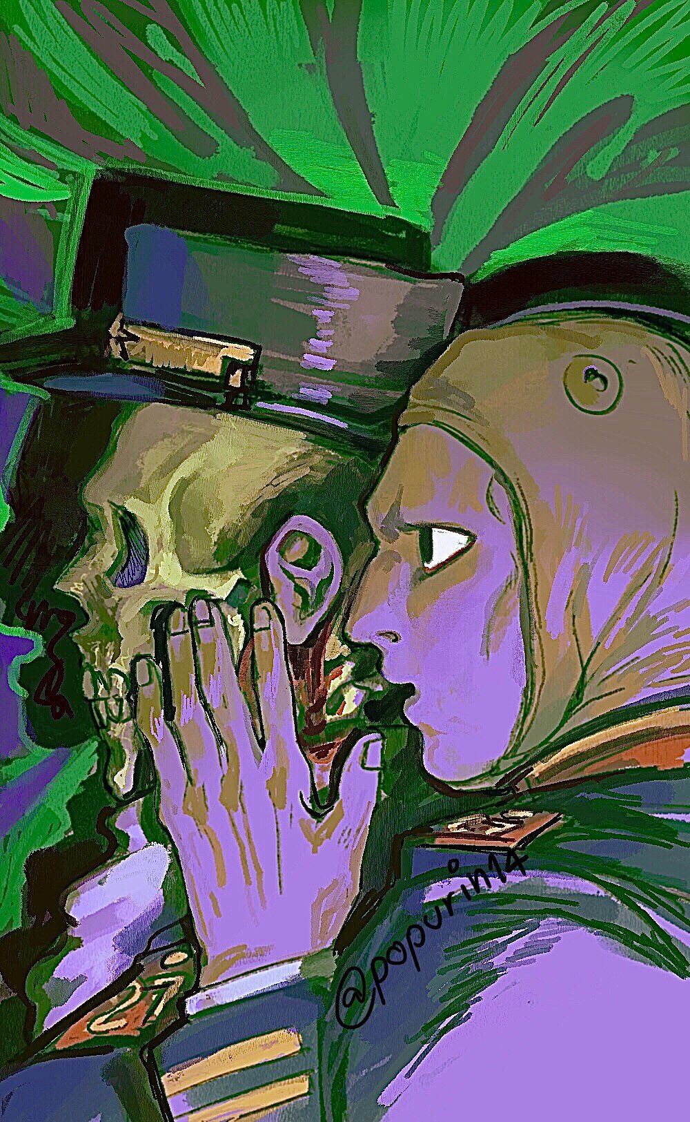 2boys artist_name black_eyes blood brothers cheekbones commentary english_commentary golden_kamuy green_background hand_up hat highres imperial_japanese_army kepi long_sleeves male_focus military military_hat military_uniform multiple_boys nikaidou_kouhei nikaidou_youhei popurin14 profile short_hair siblings skull twins whispering