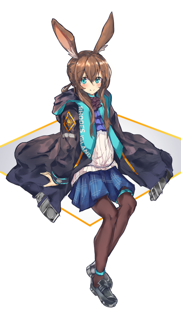 1girl amiya_(arknights) animal_ears anklet arknights ascot black_jacket black_pantyhose black_shoes blue_ascot blue_eyes blue_skirt blush brown_hair clothes_writing full_body greypidjun hair_between_eyes invisible_chair jacket jewelry long_sleeves looking_at_viewer open_clothes open_jacket pantyhose plaid_clothes plaid_skirt pleated_skirt ponytail rabbit_ears rabbit_girl shirt shoes sidelocks simple_background sitting skirt smile solo thighlet white_background white_shirt