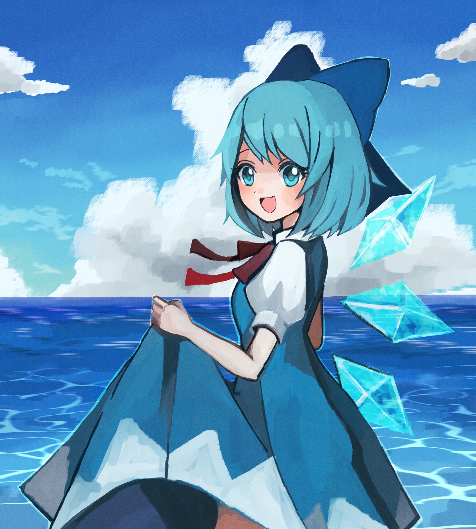 1girl :d blue_bow blue_dress blue_eyes blue_hair blue_sky bow cirno clothes_lift cloud dress dress_lift hair_bow highres holding_own_dress horizon ice ice_wings lifting_own_clothes looking_at_viewer mo_25_mo open_mouth short_hair short_sleeves sky smile solo standing touhou wings