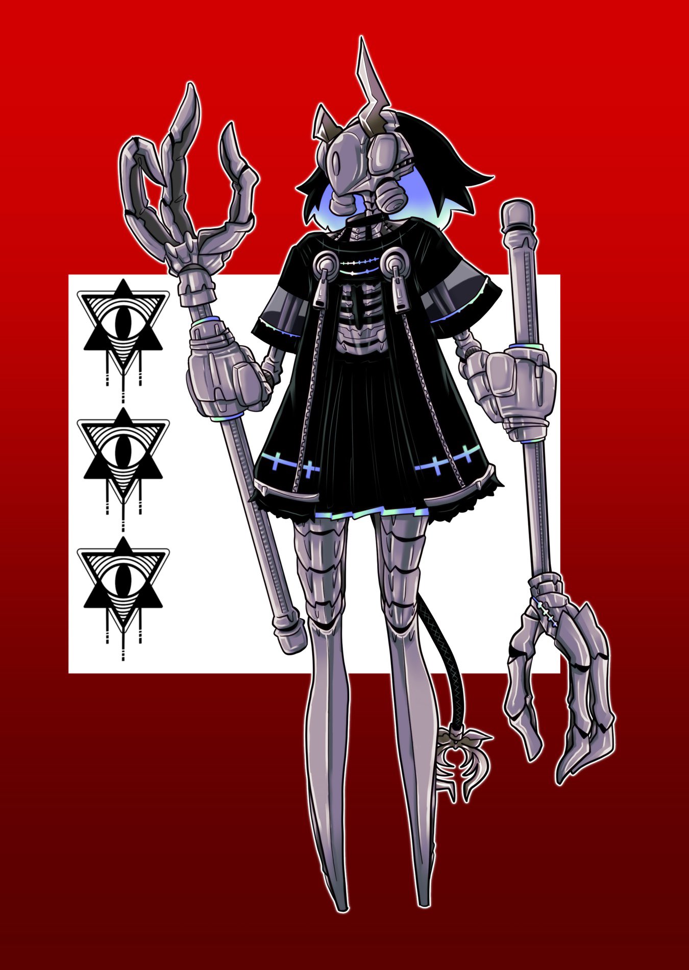 arakiinochi black_dress black_hair blue_hair claws commentary_request cross demon_horns demon_tail dress eye_of_providence full_body highres horns multicolored_hair nanashi_inc. no_humans outline robot shishio_chris short_dress short_sleeves tail two-tone_hair virtual_youtuber white_outline zipper