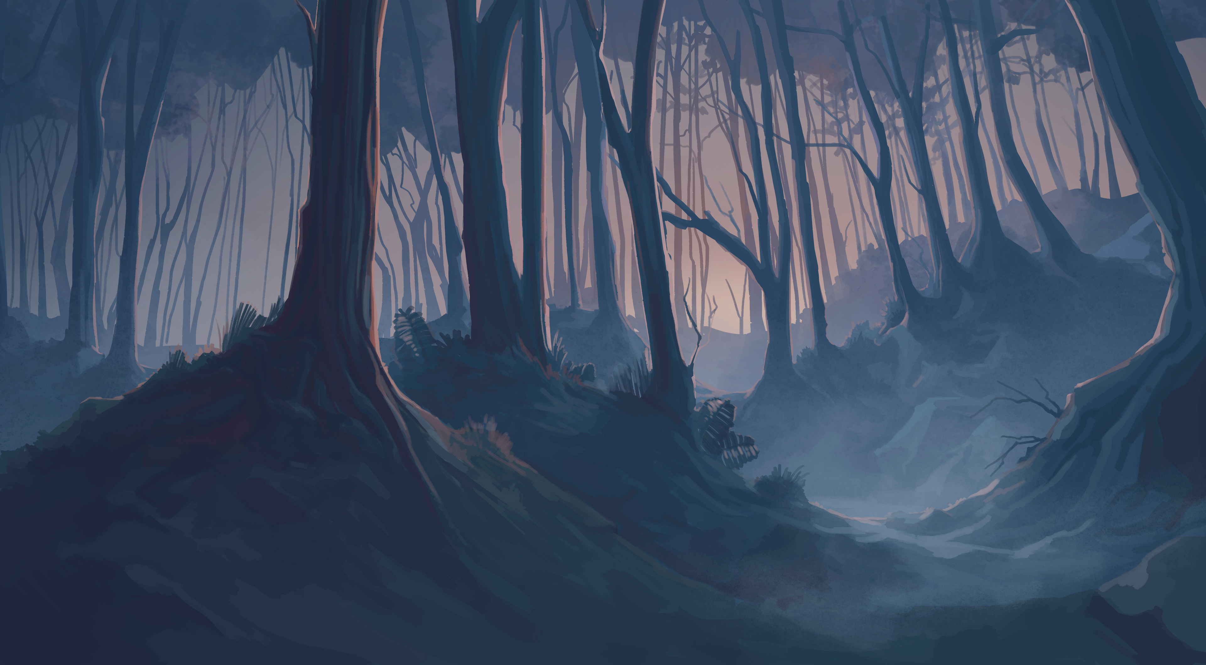 absurdres backlighting commentary dark der_erlkonig english_commentary fog forest german_commentary highres hill landscape malgorzata_miklaszewska mixed-language_commentary nature night no_humans plant plant_roots scenery tagme tree