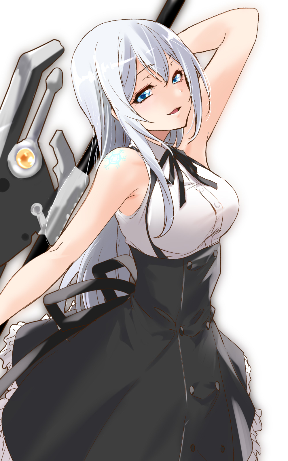 1girl arm_behind_head arm_up assault_lily bare_arms bare_shoulders black_ribbon black_skirt blue_eyes breasts buttons collared_shirt commentary_request cowboy_shot frilled_skirt frills grey_hair hair_between_eyes high-waist_skirt highres holding holding_behind_back holding_weapon holding_weapon_behind_back large_breasts long_hair looking_at_viewer looking_to_the_side miniskirt neck_ribbon outstretched_arm parted_lips ribbon rosalinde_friedegunde_von_otto school_uniform shirt shoulder_tattoo sidelocks sideways_glance simple_background skirt sleeveless sleeveless_shirt solo standing suspender_skirt suspenders tattoo urutsu_sahari very_long_hair weapon white_background white_shirt yurigaoka_girls_academy_school_uniform
