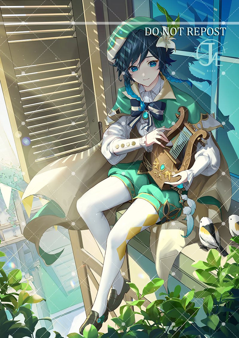 0jae 1boy bird black_footwear genshin_impact instrument pantyhose sitting venti_(genshin_impact) white_pantyhose window