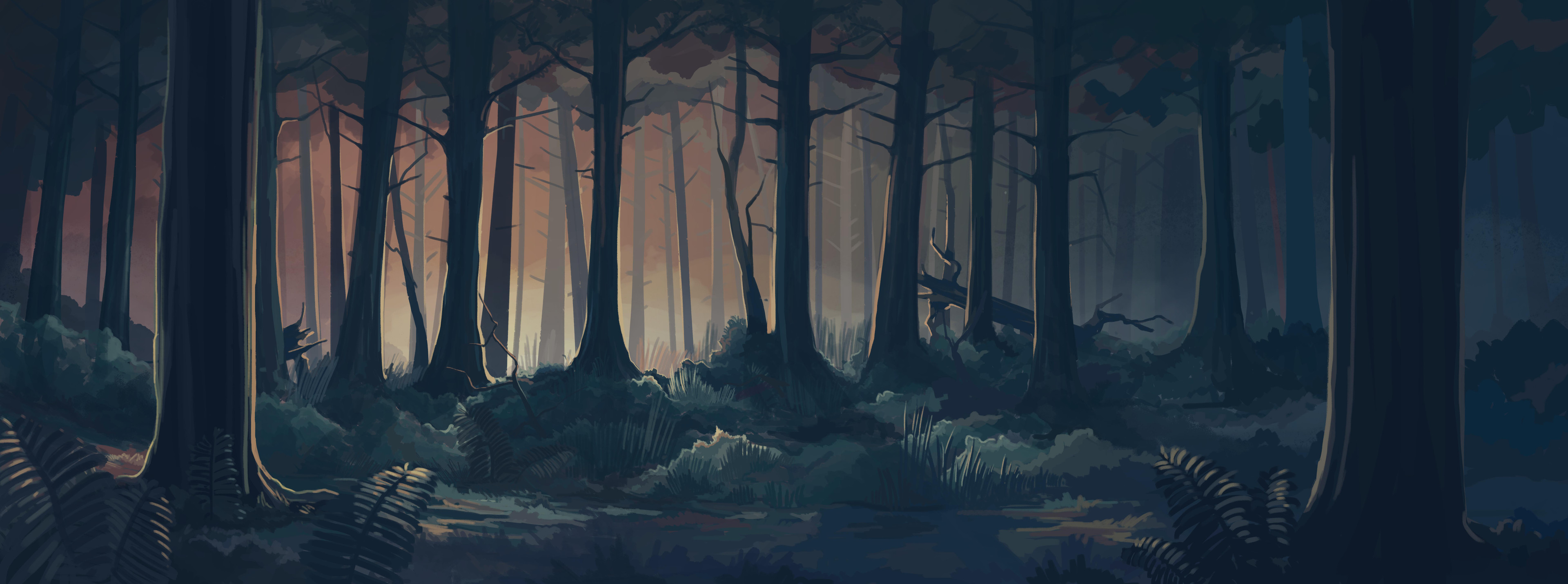 absurdres backlighting commentary dark der_erlkonig english_commentary fern forest german_commentary grass highres landscape malgorzata_miklaszewska mixed-language_commentary nature no_humans outdoors plant scenery sunset tagme tree