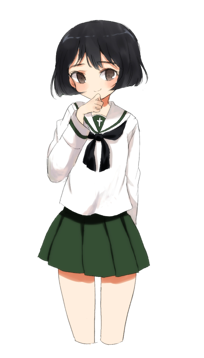 1girl arm_behind_back black_eyes black_hair black_neckerchief blouse closed_mouth commentary cowboy_shot cropped_legs girls_und_panzer green_skirt hand_on_own_chin long_sleeves looking_at_viewer miniskirt neckerchief one-hour_drawing_challenge ooarai_school_uniform pleated_skirt ri_(qrcode) sailor_collar school_uniform serafuku shirt short_hair simple_background skirt smile solo standing utsugi_yuuki white_background white_sailor_collar white_shirt