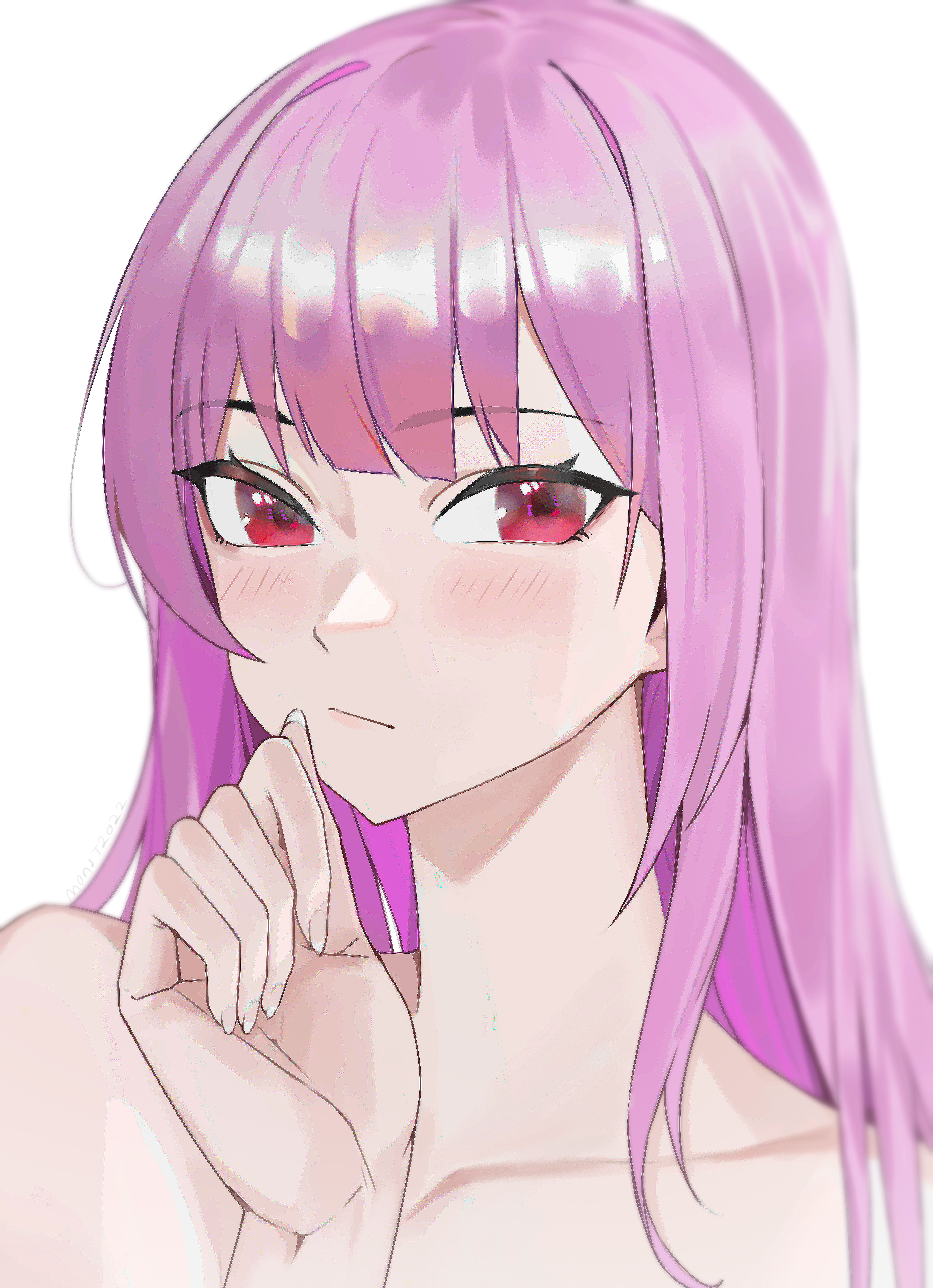 1girl absurdres blush closed_mouth collarbone commentary darkzmonsty english_commentary highres hololive hololive_english long_hair mori_calliope nude pink_hair red_eyes simple_background solo upper_body virtual_youtuber white_background