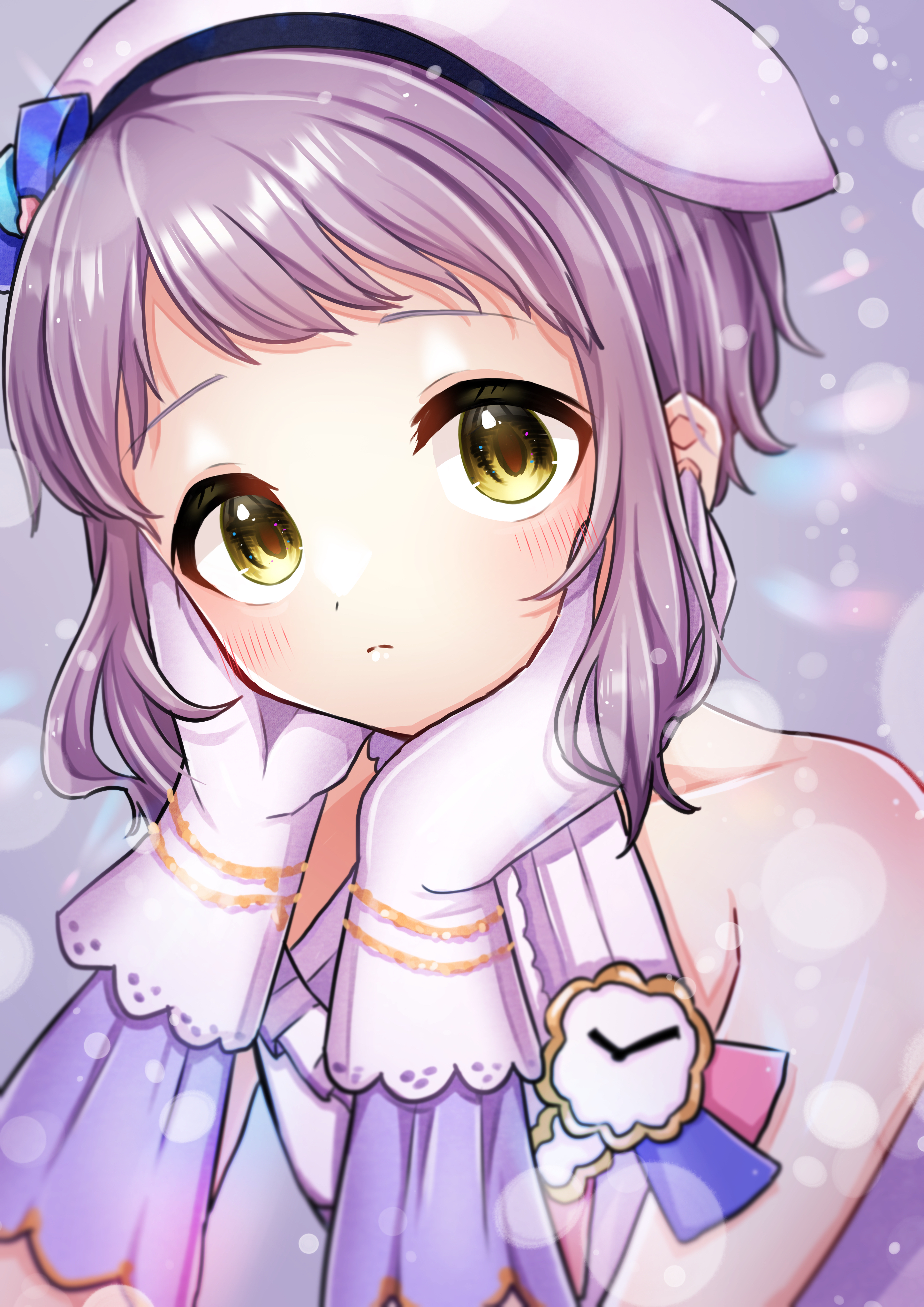 1girl absurdres bare_shoulders beret blush bubble_background clock collarbone commentary_request dress expressionless gloves hands_on_own_cheeks hands_on_own_face hat highres idolmaster idolmaster_million_live! looking_at_viewer makabe_mizuki marieshi purple_background purple_dress purple_hair short_hair sidelocks sleeveless sleeveless_dress solo upper_body white_gloves white_hat yellow_eyes