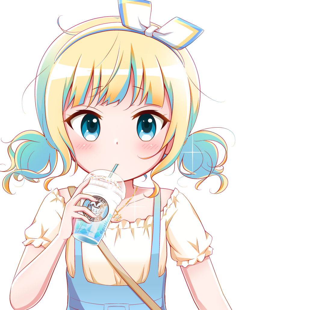 1girl blonde_hair blue_eyes blue_hair blue_skirt collarbone cup disposable_cup drinking_straw gochuumon_wa_usagi_desu_ka? goth_risuto hairband holding holding_cup jewelry kirima_syaro low_twintails multicolored_hair pendant shirt short_sleeves simple_background skirt solo suspender_skirt suspenders twintails two-tone_hair upper_body white_background white_hairband white_shirt