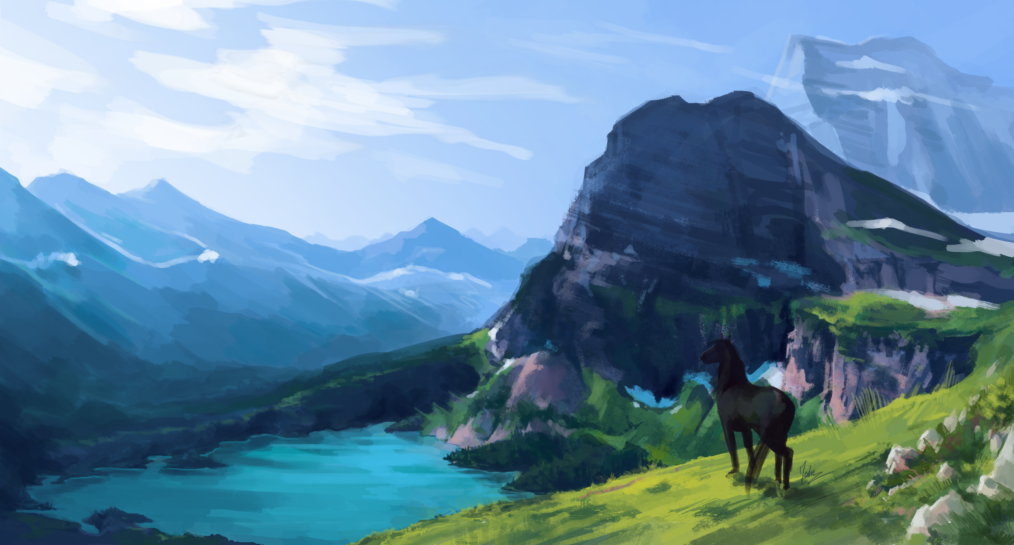 absurdres animal black_horse blue_sky cliff commentary day english_commentary grass highres horse lake landscape malgorzata_miklaszewska mountain nature no_humans original outdoors scenery signature sky