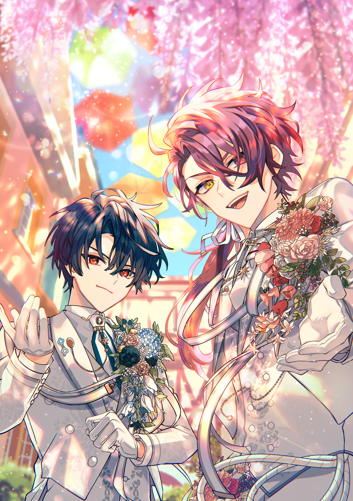 2boys black_hair bouquet cain_knightley closed_mouth flower formal_clothes heterochromia highres long_hair looking_at_viewer mahoutsukai_no_yakusoku male_focus multiple_boys naruta_iyo open_mouth ponytail red_eyes red_hair shino_sherwood short_hair smile suit teeth yellow_eyes
