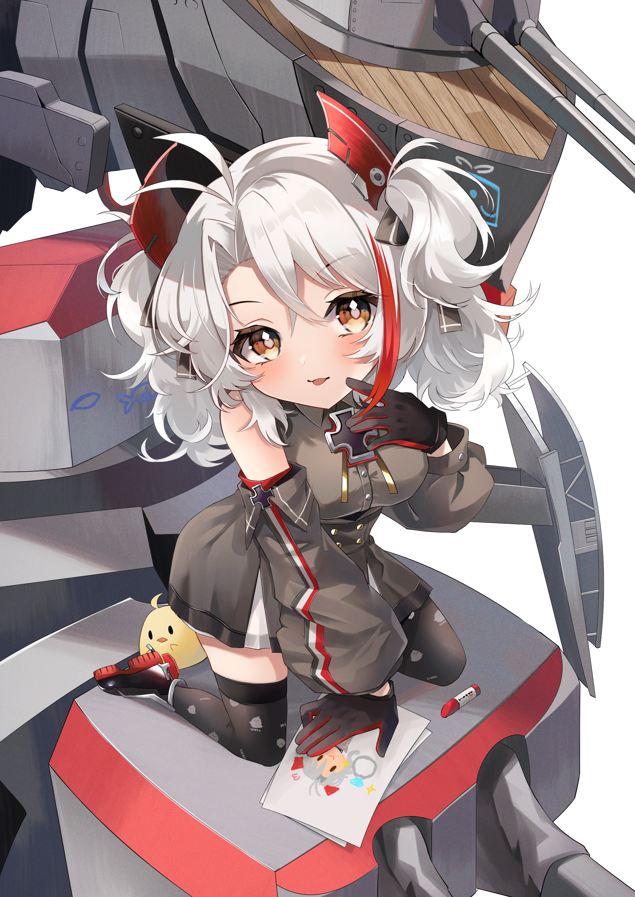 1girl absurdres antenna_hair artillery azur_lane black_dress black_gloves black_thighhighs breasts child's_drawing crayon cross drawing_(object) dress full_body gloves hair_between_eyes highres iron_cross jewelry kneeling large_breasts little_prinz_eugen_(azur_lane) long_hair looking_at_viewer manjuu_(azur_lane) multicolored_hair oppai_loli print_thighhighs red_gloves red_hair rigging ring ship_turret short_dress solo streaked_hair thighhighs two-tone_gloves two-tone_hair wedding_ring white_hair yamaha_tsui yellow_eyes zettai_ryouiki