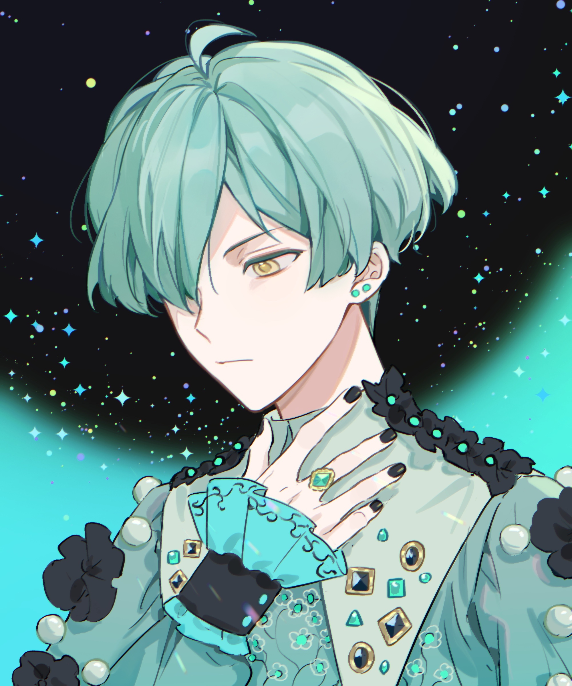 1boy absurdres ahoge alternate_costume aqua_hair aqua_nails aqua_skirt bishounen collared_shirt earrings frills from_side hair_between_eyes hair_over_one_eye highres idolish7 isumi_haruka jewelry lens_flare looking_at_viewer male_focus nail_polish ring shirt short_hair skirt solo star_(symbol) upper_body yellow_eyes zheyizheyi