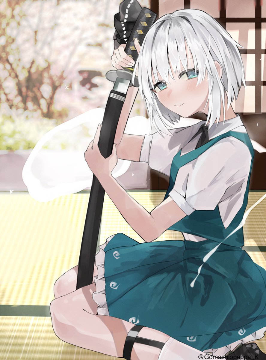 1girl cherry_blossoms collared_shirt gomashiopappa_k green_eyes green_skirt green_vest grey_hair hair_ribbon hakugyokurou highres konpaku_youmu konpaku_youmu_(ghost) looking_at_viewer ribbon sheath shirt short_hair skirt sliding_doors smile sword thighs touhou vest weapon white_shirt