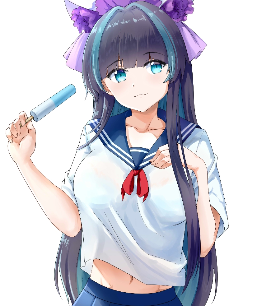 1girl :3 akusamu animal_ears arms_up azur_lane blue_eyes breasts cheshire_(azur_lane) crop_top fake_animal_ears food grey_hair hair_ribbon hand_on_own_chest holding large_breasts long_hair multicolored_hair popsicle ribbon school_uniform serafuku shirt_overhang streaked_hair two-tone_hair upper_body white_background