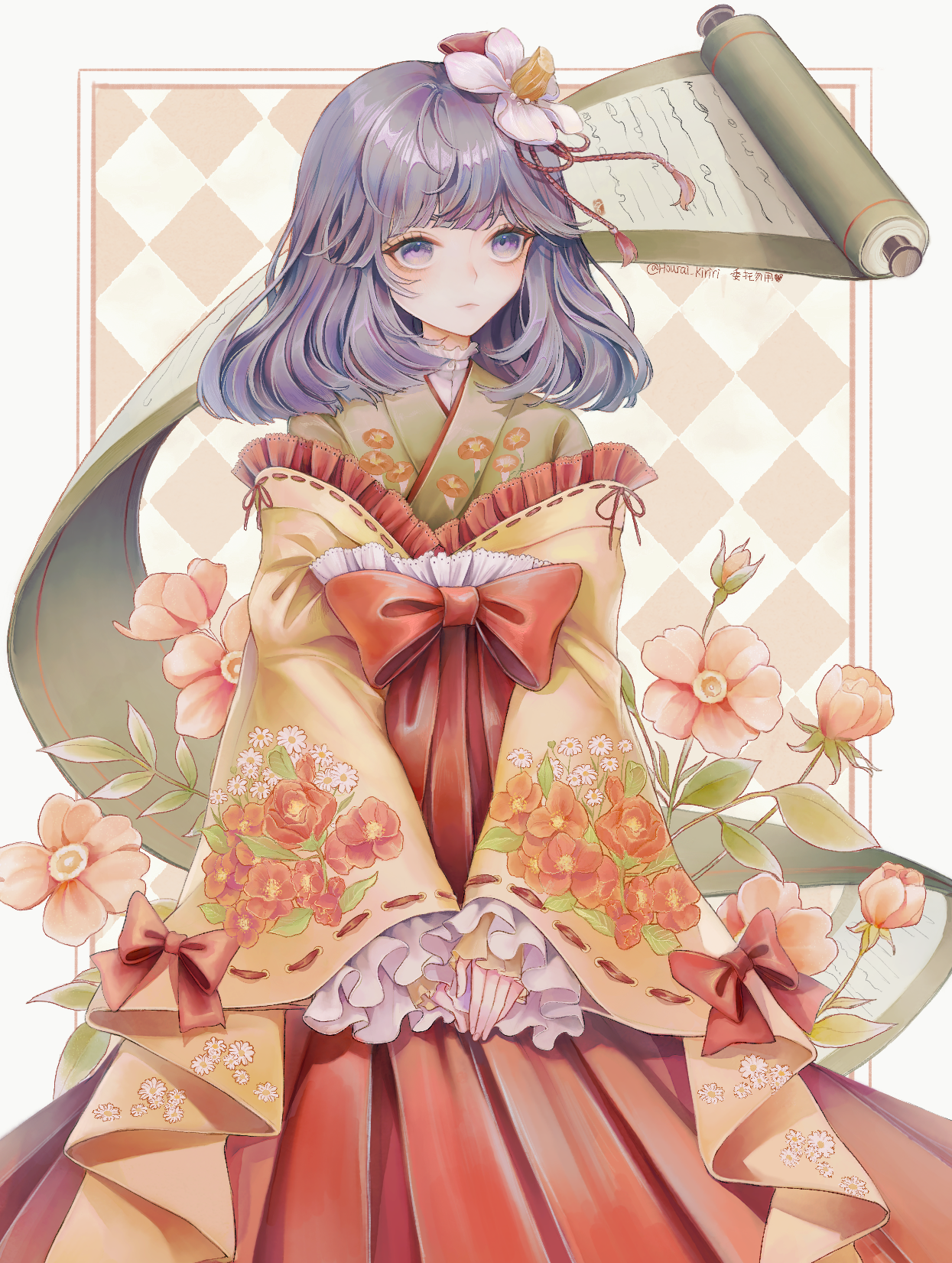 1girl bow chinese_commentary commentary_request cowboy_shot floral_print flower flower_request frilled_kimono frilled_sleeves frills green_kimono hair_flower hair_ornament hakama hieda_no_akyuu highres hourai_kiriri japanese_clothes kimono layered_clothes layered_kimono long_sleeves looking_at_viewer medium_hair own_hands_together partial_commentary purple_eyes purple_hair red_bow red_hakama ribbon-trimmed_kimono ribbon_trim scroll signature solo touhou twitter_username waist_bow wide_sleeves yellow_kimono