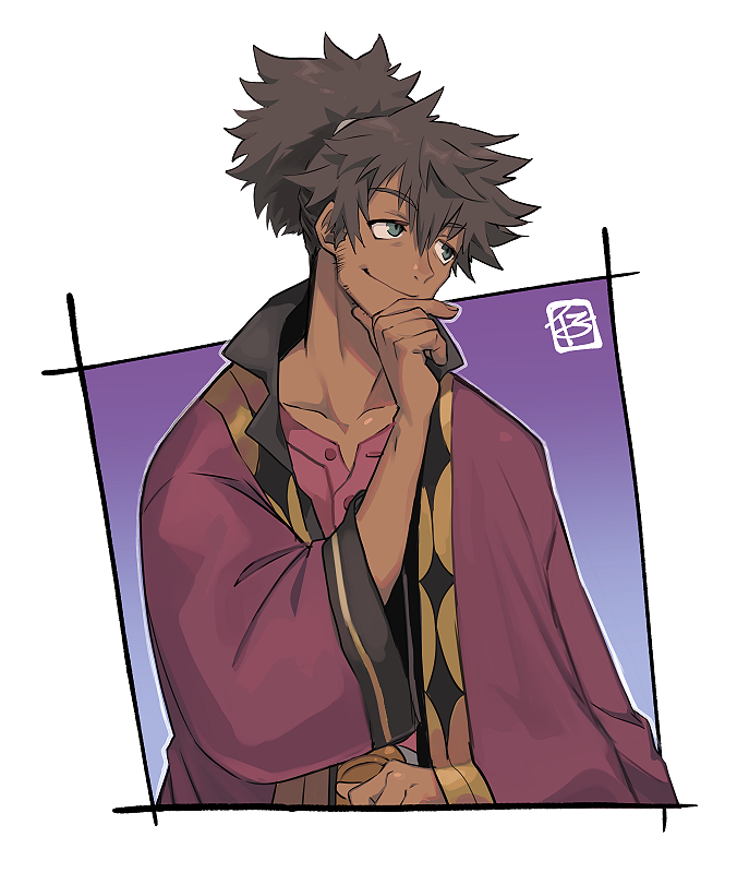 1boy black_hair blue_eyes border coat facial_hair hair_between_eyes kinako_(462) long_hair looking_to_the_side male_focus ponytail purple_shirt raven_(tales) shirt smile solo stubble tales_of_(series) tales_of_vesperia tan