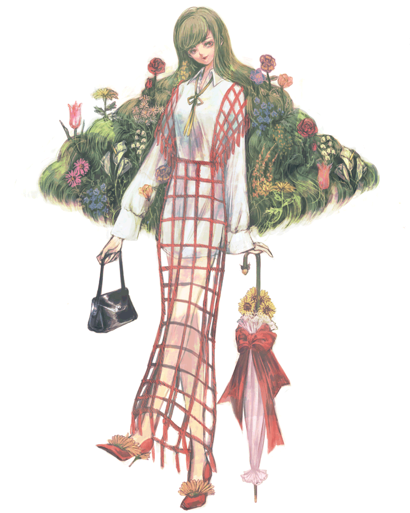 1girl alternate_costume bag black_bag closed_umbrella collared_shirt commentary_request flower flower_request full_body green_hair green_ribbon hair_flower hair_ornament handbag head_tilt high_heels holding holding_bag holding_umbrella kazami_yuuka lips long_hair long_sleeves looking_at_viewer nazo_(mystery) neck_ribbon net parasol red_eyes red_footwear red_ribbon ribbon shirt solo sunflower touhou umbrella umbrella_flower white_background white_shirt wing_collar