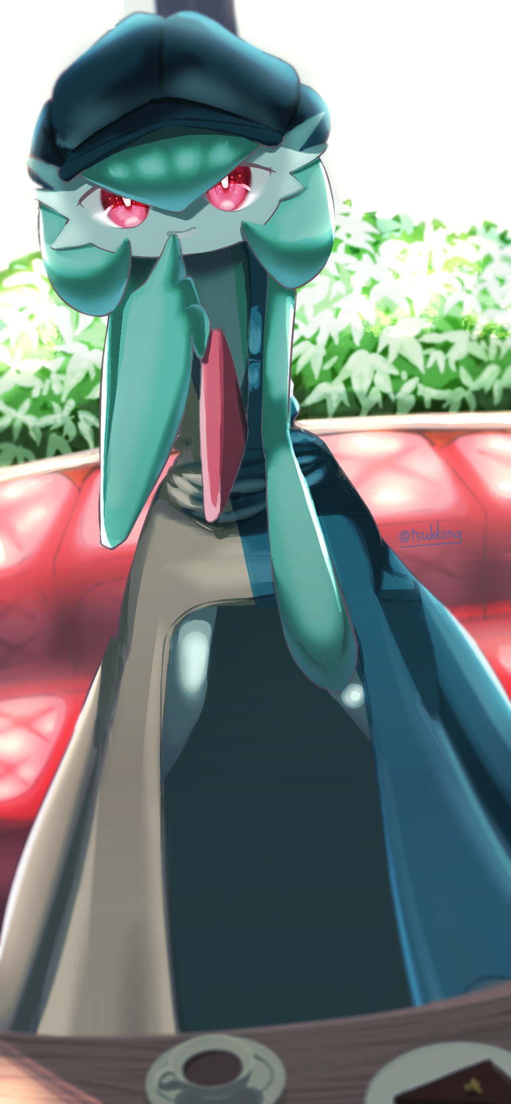 1girl artist_name blue_dress blue_hat blurry blurry_foreground bob_cut bright_pupils bush newsboy_cap cake coffee colored_skin cup dress drink dutch_angle female_focus finger_to_mouth flat_chest food gardevoir gardevoir_(cafe) gen_3_pokemon green_hair green_skin grin hair_between_eyes hand_on_own_knee hand_up happy hat highres indoors looking_at_viewer multicolored_skin nintendo plate pokemon pokemon_(creature) pokemon_unite red_eyes saucer short_hair signature smile solo straight-on table teacup teeth tsukkon twitter_username two-tone_dress two-tone_skin white_pupils white_skin window yellow_dress