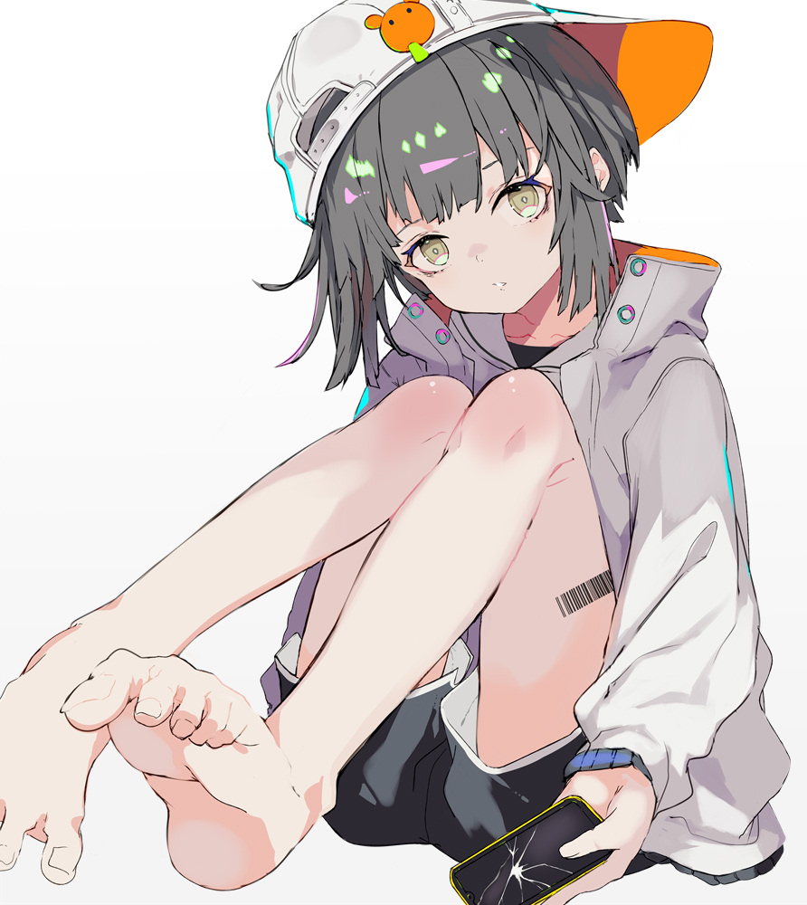 1girl barcode barcode_tattoo barefoot black_shorts bob_cut broken_screen cellphone dolphin_shorts feet female_focus grey_hair hat high_collar holding holding_phone jacket leg_tattoo looking_at_viewer original parted_lips phone shiromiso shorts sideways_hat simple_background sitting smartphone soles solo tattoo toe_scrunch toes white_background white_hat