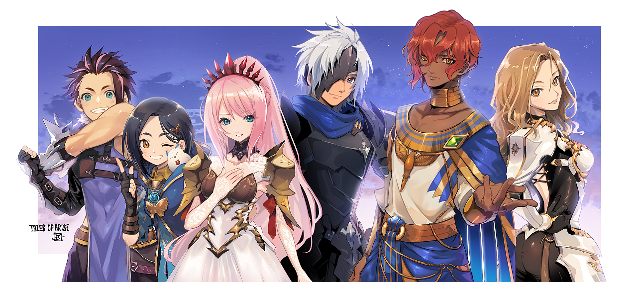 3boys 3girls alphen_(tales) armor back_cutout bird black_hair blonde_hair blue_eyes blush bodysuit braid breasts cleavage closed_mouth clothing_cutout collarbone cross-laced_clothes crown dark-skinned_male dark_skin dohalim_(tales) dress earrings fingerless_gloves floating_earrings hootle_(tales) gloves grey_hair hair_between_eyes hair_ornament hand_on_own_chest hood jewelry kinako_(462) kisara_(tales) law_(tales) long_hair looking_at_viewer mask medium_breasts multicolored_hair multiple_boys multiple_girls owl pink_hair ponytail red_hair rinwell_(tales) scarf shionne_(tales) short_hair shoulder_armor sidelocks smile tales_of_(series) tales_of_arise very_long_hair white_dress yellow_eyes