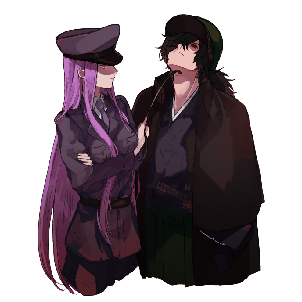 1boy 1girl alternate_costume black_hair fate/type_redline fate_(series) femdom long_hair medusa_(fate) nekoyamiyako okada_izou_(fate) purple_eyes purple_hair red_eyes simple_background white_background