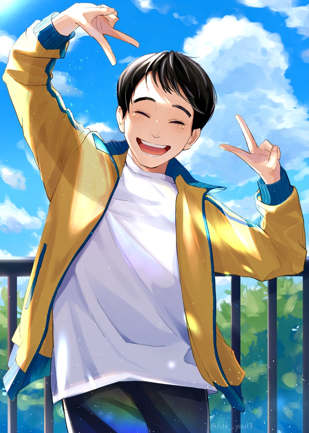 1boy :d artist_name black_hair black_pants blue_sky closed_eyes cloud copyright_request day double_v facing_viewer highres htk_you13 jacket male_focus open_mouth outdoors pants railing shirt short_hair sky smile solo v white_shirt yellow_jacket