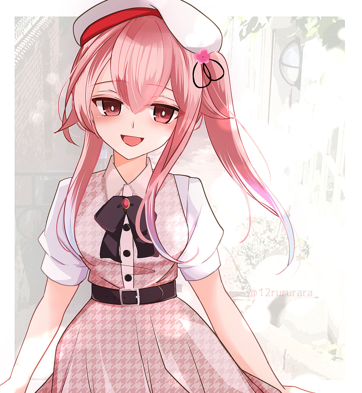 1girl belt belt_buckle beret black_belt black_ribbon blush buckle buttons dress gradient_hair hair_between_eyes hair_ribbon harusame_(kancolle) harusame_(lawson)_(kancolle) hat highres kantai_collection long_hair multicolored_hair official_alternate_costume open_mouth pink_dress pink_eyes pink_hair ribbon short_sleeves side_ponytail smile solo tonome_(rururara) upper_body white_hat