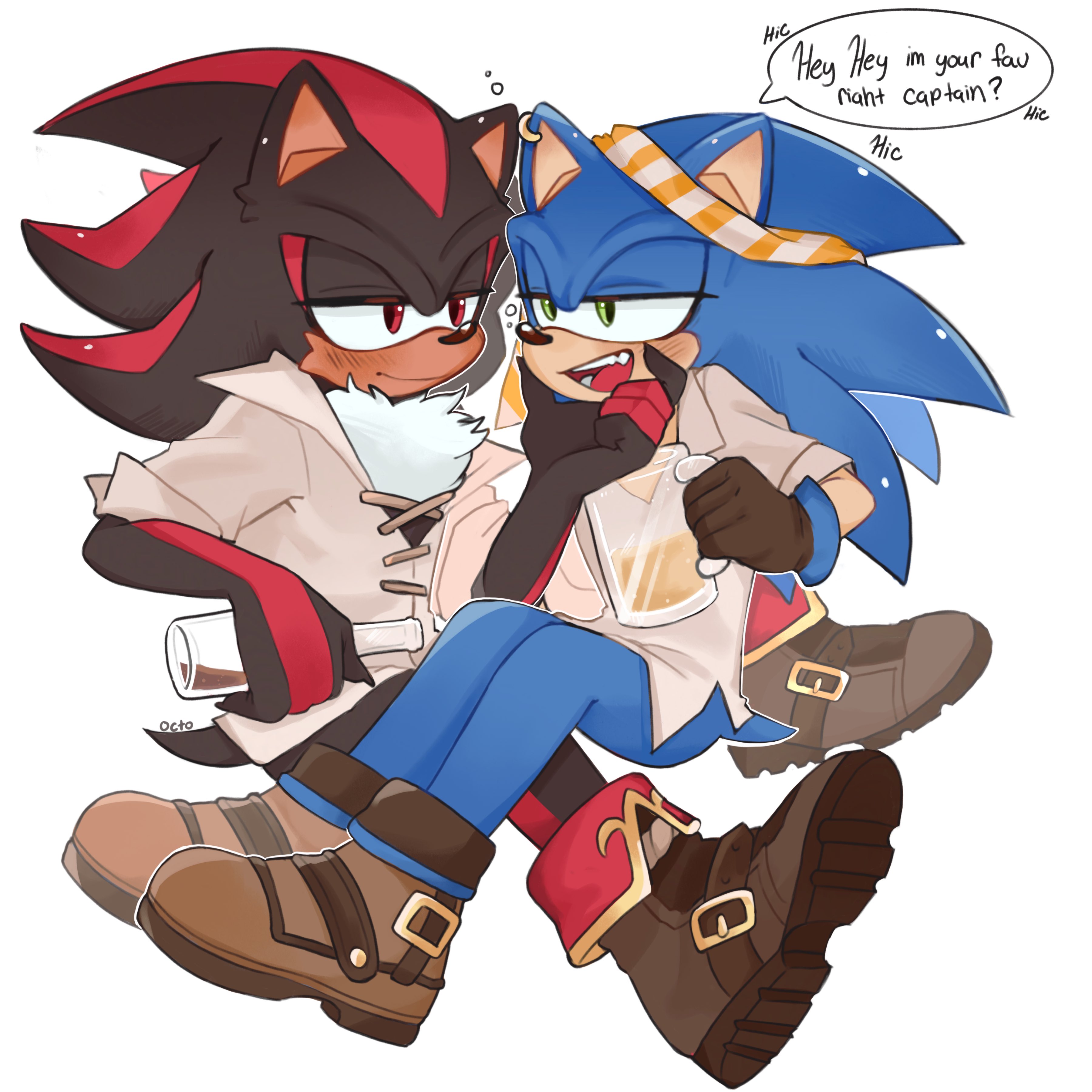 2boys 3mia_hadi3 absurdres alcohol alternate_costume animal_ears animal_nose beer_mug black_fur black_hair blue_fur blue_hair blush body_fur boots bottle bottomless brown_footwear brown_gloves buckle closed_mouth collared_shirt cup drinking_glass drunk earrings english_text eye_contact fang full_body furry furry_male furry_with_furry gloves green_eyes half-closed_eyes hand_on_another's_chin hand_up happy highres holding holding_bottle holding_cup jewelry legs_together long_hair looking_at_another male_focus mug multicolored_fur multicolored_hair multiple_boys necktie necktie_on_head no_gloves open_mouth red_eyes red_fur red_hair shadow_the_hedgehog shadow_the_hedgehog_(captain) shirt short_sleeves sideways_mouth simple_background single_earring sitting sitting_on_lap sitting_on_person smile sonic_(series) sonic_the_hedgehog sonic_the_hedgehog_(pirate) speech_bubble spiked_hair squeans streaked_hair striped_clothes striped_necktie tail talking teeth tongue two-tone_hair white_background white_fur white_shirt yaoi yellow_necktie