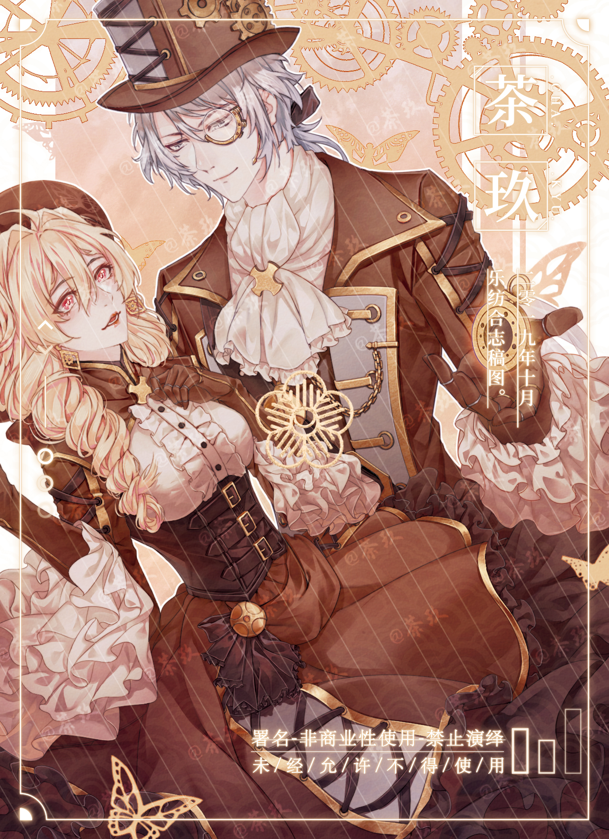 1boy 1girl alternate_costume blonde_hair corset dress frilled_dress frills glasses hair_between_eyes hair_intakes hat highres idolish7 long_hair looking_at_viewer low_ponytail ponytail shuaib999 smile takanashi_tsumugi top_hat victorian yaotome_gaku