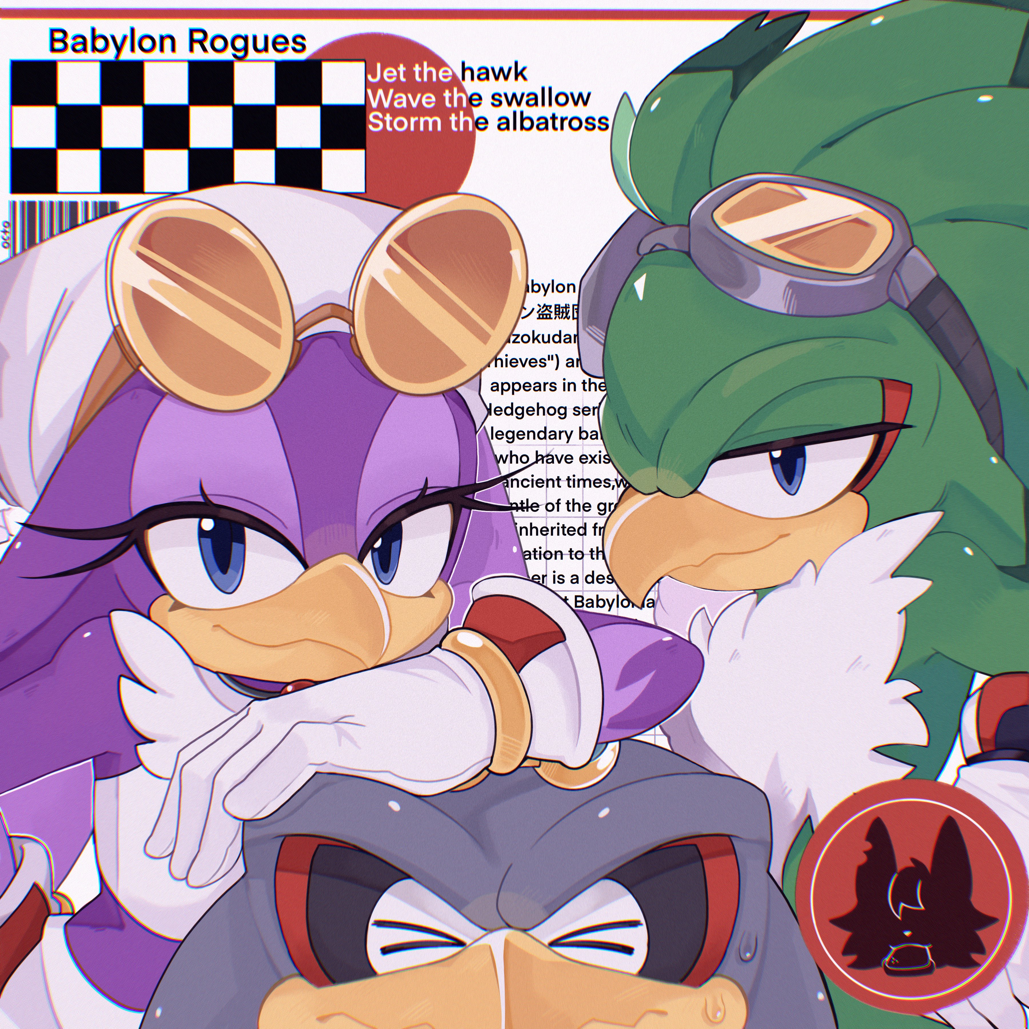 >_< 1girl 2boys 3mia_hadi3 absurdres barcode beak bird_boy bird_girl blue_eyes body_fur character_name chromatic_aberration closed_eyes closed_mouth crop_top english_text eyewear_on_head furry furry_female furry_male gloves goggles green_fur green_hair grey-framed_eyewear grey_fur half-closed_eyes hand_on_another's_head happy hat highres jet_the_hawk leaning_on_person long_hair looking_at_viewer midriff multicolored_hair multiple_boys orange-tinted_eyewear pants purple_fur purple_hair rimless_eyewear round_eyewear shirt sleeveless sleeveless_shirt smile sonic_(series) sonic_riders sonic_riders_(series) storm_the_albatross straight-on sunglasses tinted_eyewear two-tone_fur two-tone_hair upper_body wave_the_swallow white_fur white_gloves white_headwear white_pants white_shirt