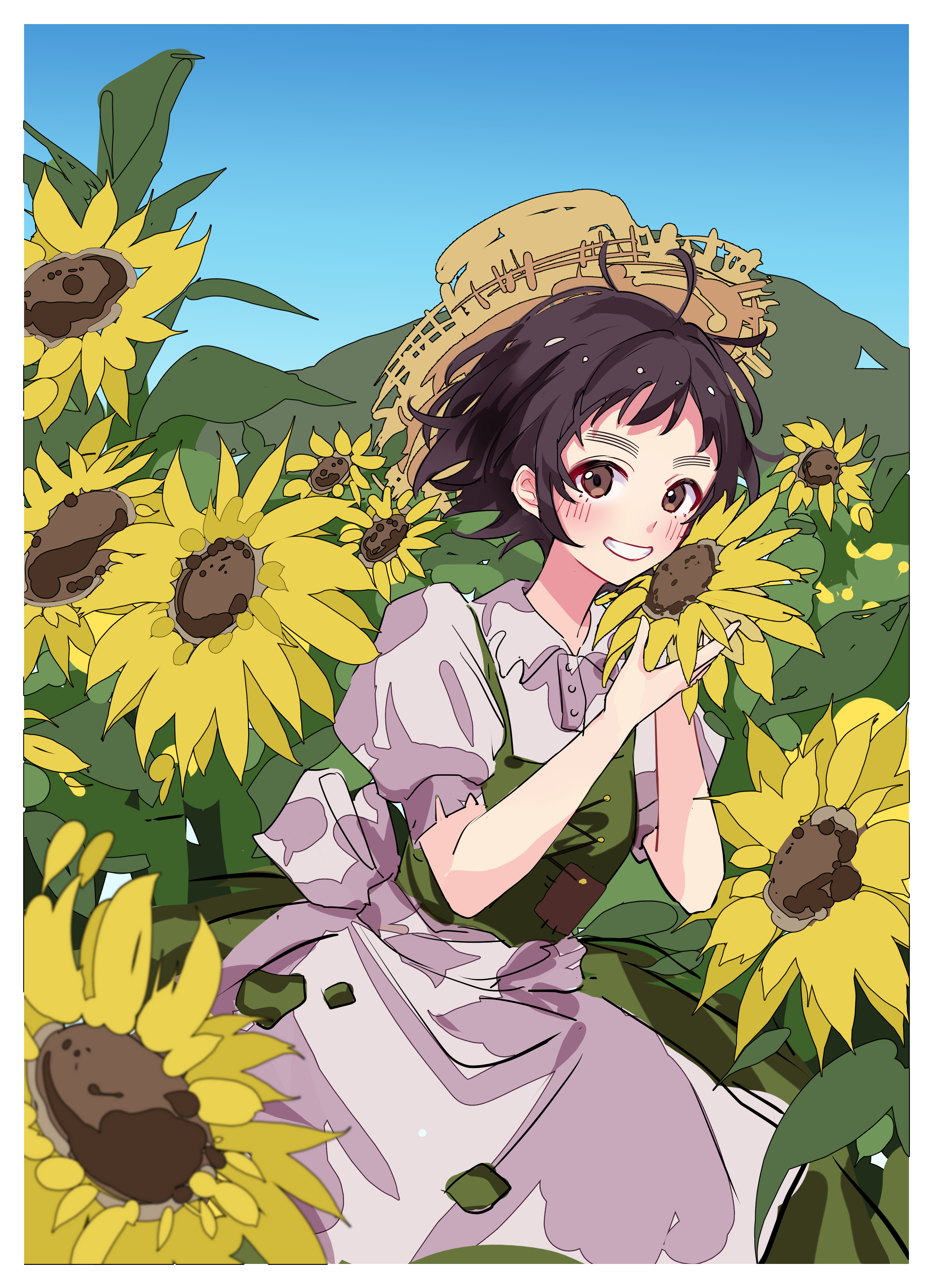 1girl absurdres ahoge blush brown_eyes brown_hair day dress flower hat heroine_tarumono! highres holding holding_flower honeyworks kuailemaoamaomao^o^ looking_at_viewer messy_hair outdoors smile solo standing straw_hat sun_hat sunflower suzumi_hiyori white_dress