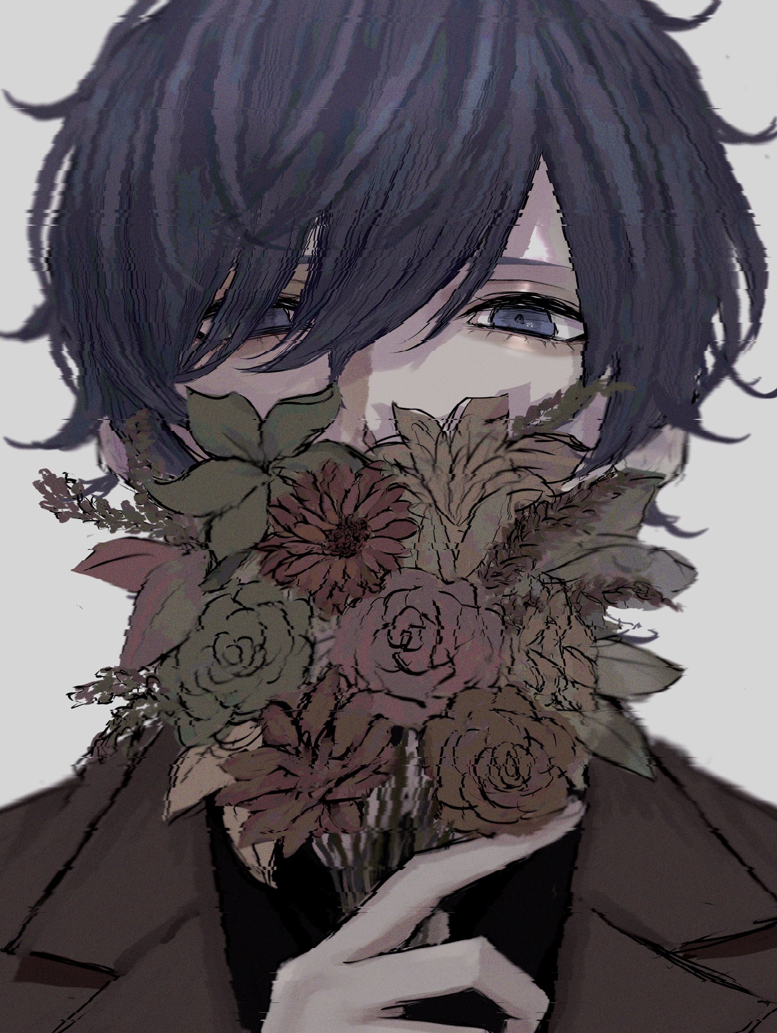 1boy avanokabeuch black_hair blue_eyes bouquet brown_jacket covered_mouth flower glitch hair_between_eyes highres holding holding_bouquet jacket male_focus original portrait simple_background solo unfinished white_background